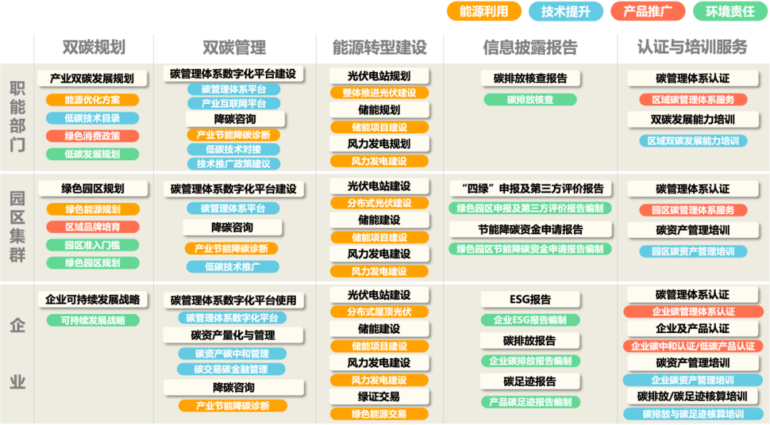 图2充分考虑目前纺织服装产业发展的实际情况,以矩阵模式列出了详细的“双碳行动”解决方案,从双碳规划、双碳管理、能源转型建设、信息披露报告、认证与培训服务五个维度,指出了地方政府职能部门、园区/集群与企业三大主体的具体举措。职能部门与园区/集群管委会的部署重点应集中在新能源建设与管理、双碳数字化平台建设、能碳监测与诊断、能碳资产管理与培训、产业能碳规划与咨询、绿色园区与工厂规划、绿色项目资金申报等方面;企业的部署重点应集中在新能源建设与运营、能碳管理平台建设、碳排放与碳足迹核算、能碳资产盘查与管理、上市企业ESG报告披露、绿色与低碳产品认证等方面。地方政府部门、产业园区管理和运营者、企业管理人员可以借助这张解决方案矩阵图,找到自身在双碳发展过程中可着手开始进行的具体举措,或者根据矩阵图对自身低碳绿色发展进行通盘考虑和安排。