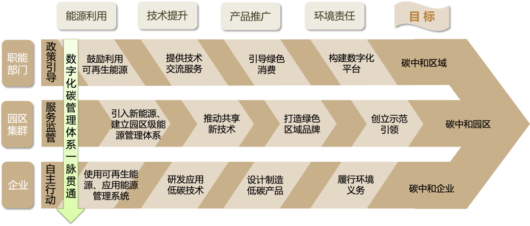能源利用:政府职能部门应加快出台差异化的能源政策,通过税收减免、研发支持等多元化措施积极引导并鼓励不同主体加强可再生能源的投入与利用。园区/集群与企业应尽快引入能源管理体系,提高清洁能源利用比例,积极利用可再生能源,如太阳能、风能等,叠加绿氢、储能技术及外购绿电,降低能源使用的碳排放;同时,提高能源使用效率,大力推广热电联产、热能梯级利用、热能回收、能源智能管控,减少能源用量。