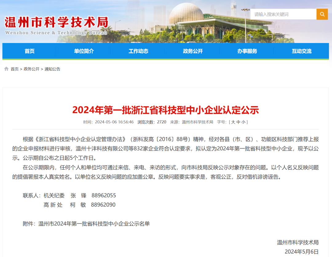 近日,温州市科学技术局公布了2024年第一批浙江省科技型中小企业认定公示名单。