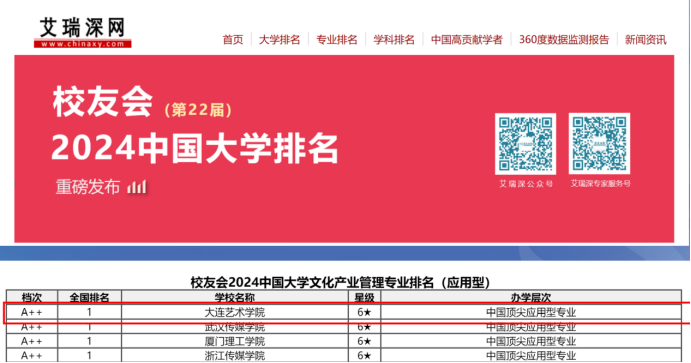 中国科教评价网发布的《2023年中国大学及学科专业评价报告》显示:在全国134所设文化产业管理专业高校中,大连艺术学院文化产业管理专业位列第5位。艾瑞深校友会中国大学专业排名显示:大连艺术学院名列校友会2024中国大学文化产业管理专业排名(应用型)第一名,为A++,6★,中国顶尖应用型专业。
