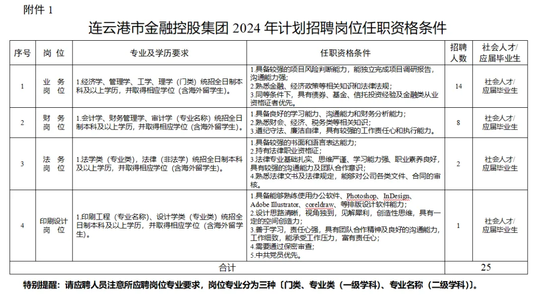 详见《连云港市金融控股集团2024年计划招聘岗位任职资格条件》(附件1),本次招聘均为集团权属公司岗位,应聘人员须服从岗位分配及岗位调剂。