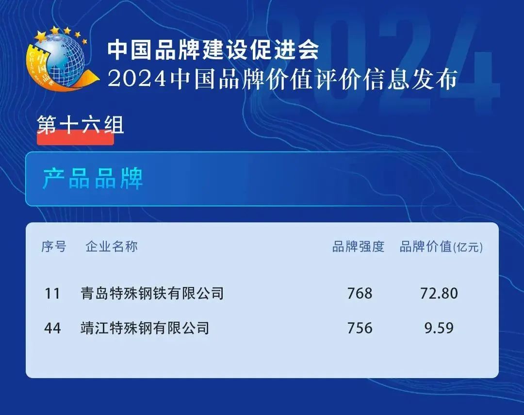 5月11日,新华社、中国品牌建设促进会、中国资产评估协会、《中国品牌》杂志社等单位在浙江德清联合发布“2024中国品牌价值评价信息”。中信泰富特钢集团在“冶金有色”组和“产品品牌”组均有两家企业上榜!