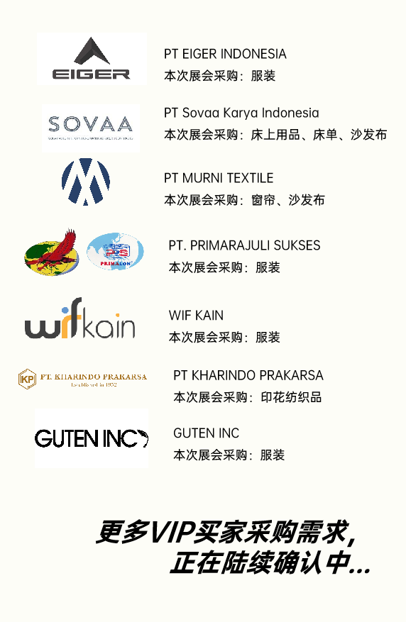 丰朗进出口·佳巨贸易·泽成进出口·寻付数字科技·芸晨服饰·丝诺纺织品·怡硕纺织·茂轩贸易·其永纺织品·昕绅进出口·悦柏进出口·登登纺织品·格伦布针纺织·润哲纺织品·美尔达布艺·节节高进出口·丹跃进出口·卡申纺织品·杰玛纺织品·耐霖纺织品·台州市国际贸易·星瑞纺织品·嘉怡新材料·玛瑟贸易·优奈特(无锡)国际贸易·麦达纺织品·鼎记印染科技·广翔豪纺织·常青树纺织·曼林对外贸易·惠翔纺织科技·凯然国际贸易·鸿卓服饰·越隆缝制设备·亮博针织·庆红家纺服饰·联堡纺织品·恒基差别化纤维·杉林久贸易·威豪进出口·子睿纺织品·润美纺织品·夏尔贸易·柑晟实业·爱旅途旅行用品·悦顺进出口·丰有服装辅料·万杰纺织新材料·柯林纺织品·隆庚布业·俊步科技·景未莱纺织品·臻禧纺织·佑金商贸·明鑫纺织科技·柏拉德织造·恒立信息科技·圣地旅游用品·腾誉织造·杭洋贸易·茂轩贸易·温馨家纺·古曼琪纺织品·国合经贸·典艺纺织品·昂业数码·荣旭纺织·飞迅进出口·鼎记纺织品·欣旺纺织·骏马纺织·金亿家居用品·金伴领带·雅韵纺织品·麻溪纺织品·PT Multi Gem Indonesia - Textilindo·PT Sukses Stabil Abadi International·PT. Suin Tekstile Technology Indonesia