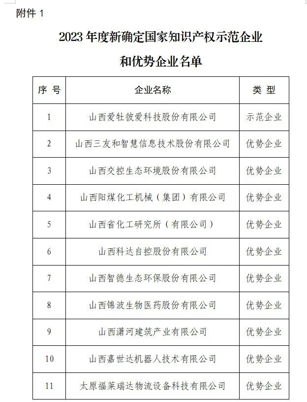根据国家知识产权局《关于确定2023年新一批及通过复核的国家知识产权示范企业和优势企业通知》(国知发运函字〔2023〕201号),确定我区1家企业为新一批国家知识产权示范企业、17家企业为新一批国家知识产权优势企业(见附件1)。新一轮国家知识产权示范企业和优势企业培育期限为2023年11月至2026年10月。