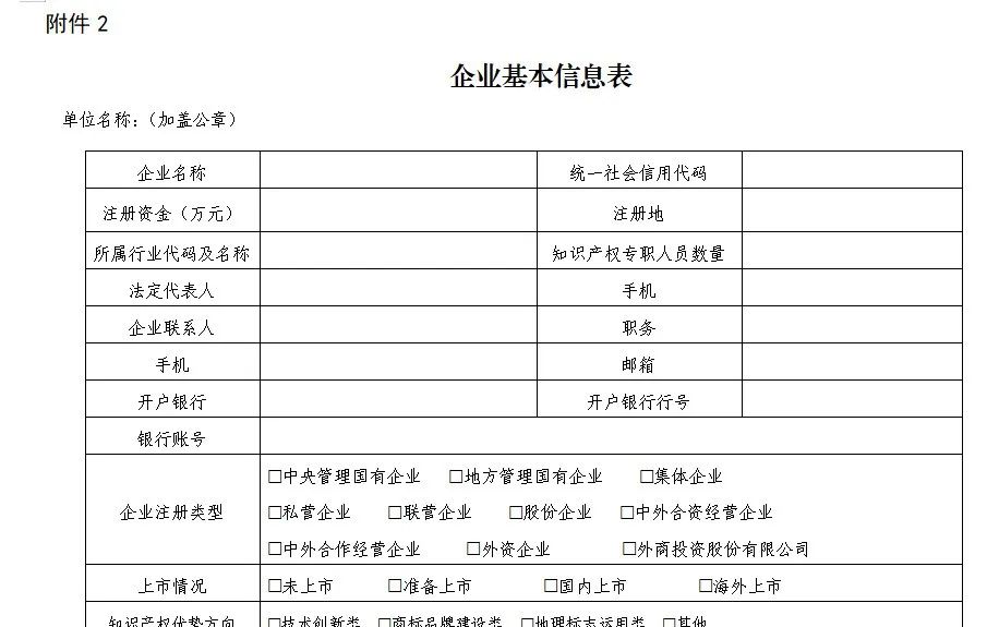 根据山西省人民政府办公厅《关于印发山西省全面推进知识产权强省建设行动方案的通知》(晋政办发〔2019〕81号),拟对新确定国家知识产权示范企业奖励20万元,对国家知识产权优势企业奖励10万元。请有关企业填写企业基本信息表并加盖单位公章(见附件2),扫描电子版发送至我局工作邮箱,报送截止时间为2024年5月16日。我局将对企业基本信息表真实性、准确性进行审核。