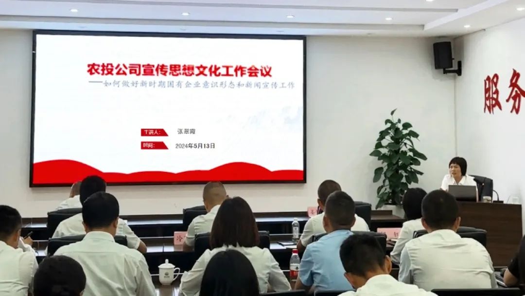 为认真学习宣贯习近平总书记关于宣传思想文化工作重要指示精神,全面加强公司意识形态工作,推动公司宣传工作提质增效。5月13日,农投公司开展第15期“农投大讲堂”专题培训会,公司党委书记、董事长张翠霞围绕“举旗帜 聚民心 育新人 兴文化 展形象”讲授专题党课。