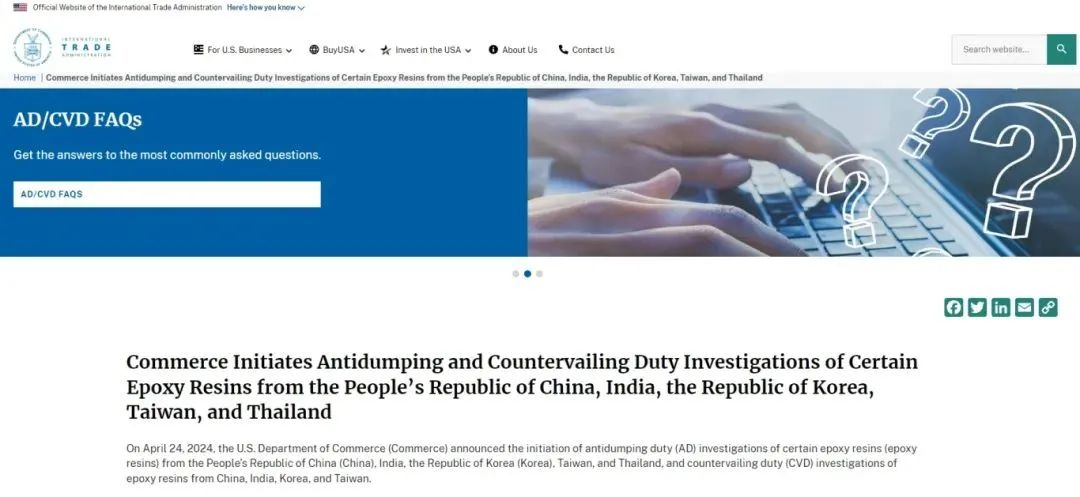 美国商务部正式对原产于中国的环氧树脂发起双反调查