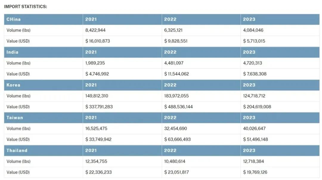 据美方统计,2023年美国自各涉案国家和地区进口被调查产品的金额分别约为:中国大陆571万美元、印度764万美元、韩国2亿美元、台湾地区5150万美元、泰国1977万美元;估计倾销幅度为:中国:264.87~351.97%、印度:11.43~17.50%、韩国:30.01~69.42%、台湾:87.19~136.02%、泰国:163.94~205.63%。