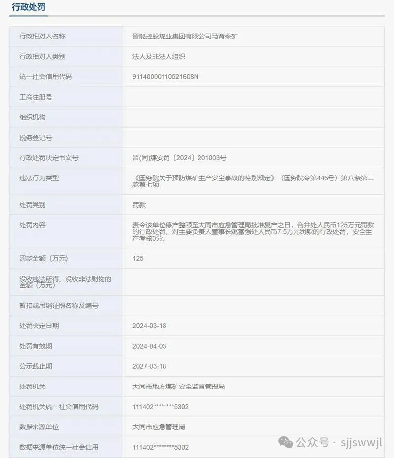 日前,国家矿山安全监察局山西局对山西大同晋能控股煤业集团有限公司马脊梁矿“1·14”一般机电事故调查处理意见作出批复,对13名相关责任人进行追责问责。其中,矿长姚某某等2人被依法移送司法机关处理。2024年1月14日22时28分,晋能控股煤业集团有限公司马脊梁矿井下石炭系3#煤层二盘区8202综采工作面发生一起一般机电事故,造成1人遇难、1人重伤,直接经济损失211.7361万元。事故发生后,矿方迟报。国家矿山安全监察局山西局牵头组织了事故调查。调查认定,马脊梁矿拒不执行监管监察指令,违法在矿井界外布置8202综采工作面非法组织开采,在明知存在风险,且未采取防倒措施、未设置安全警戒的情况下,组织人员冒险作业,造成门式支架失稳倾倒导致事故。马脊梁矿矿长姚某某全面负责矿井安全生产工作,是矿井安全生产第一责任人,拒不执行停止越界生产的监管监察指令,擅自在矿井界外布置开采工作面,且在安全监控、人员定位和视频系统未安装的情况下,强令他人冒险作业,对该起事故的发生负直接责任,依法移送司法机关处理。马脊梁矿安装队副队长赵某,事故当班现场作业负责人,其在8202采煤工作面回风顺槽维护门式支架作业时,明知支架顶梁未接顶情况下,未按操作规程要求采取有效防倒措施,对该起事故发生负直接责任,依法移送司法机关处理。此外,对马脊梁矿党委书记给予撤销党内职务处分和行政处罚;对马脊梁矿安全副矿长、机电副矿长等2人给予党内严重警告、撤职处分和行政处罚;对马脊梁矿机电管理部部长、安装队队长、安装队党支部书记等5人给予党纪政务处分;对晋能控股煤业集团有限公司分管机电工作的副总经理、机电管理部部长等2人给予党纪处分、组织处理或行政处罚;对大同市应急管理局(地方煤矿安全监督管理局)综合行政执法支队队员1人给予组织处理。针对马脊梁矿超层越界开采的违法行为,移送大同市规划和自然资源局依法处理;对马脊梁矿行政罚款665万元,并纳入安全生产严重失信主体名单。世界晋商网注意到,今年3月,晋能控股煤业集团有限公司马脊梁矿因违反了《国务院关于预防煤矿生产安全事故的特别规定》第八条第二款第七项,被大同市地方煤矿安全监督管理局处罚。根据处罚信息显示,大同市地方煤矿安全监督管理局责令该单位停产整顿至大同市应急管理局批准复产之日,合并处罚款125万元,并对主要负责人董事长姚富强处人民币7.5万元罚款的行政处罚,安全生产考核3分。