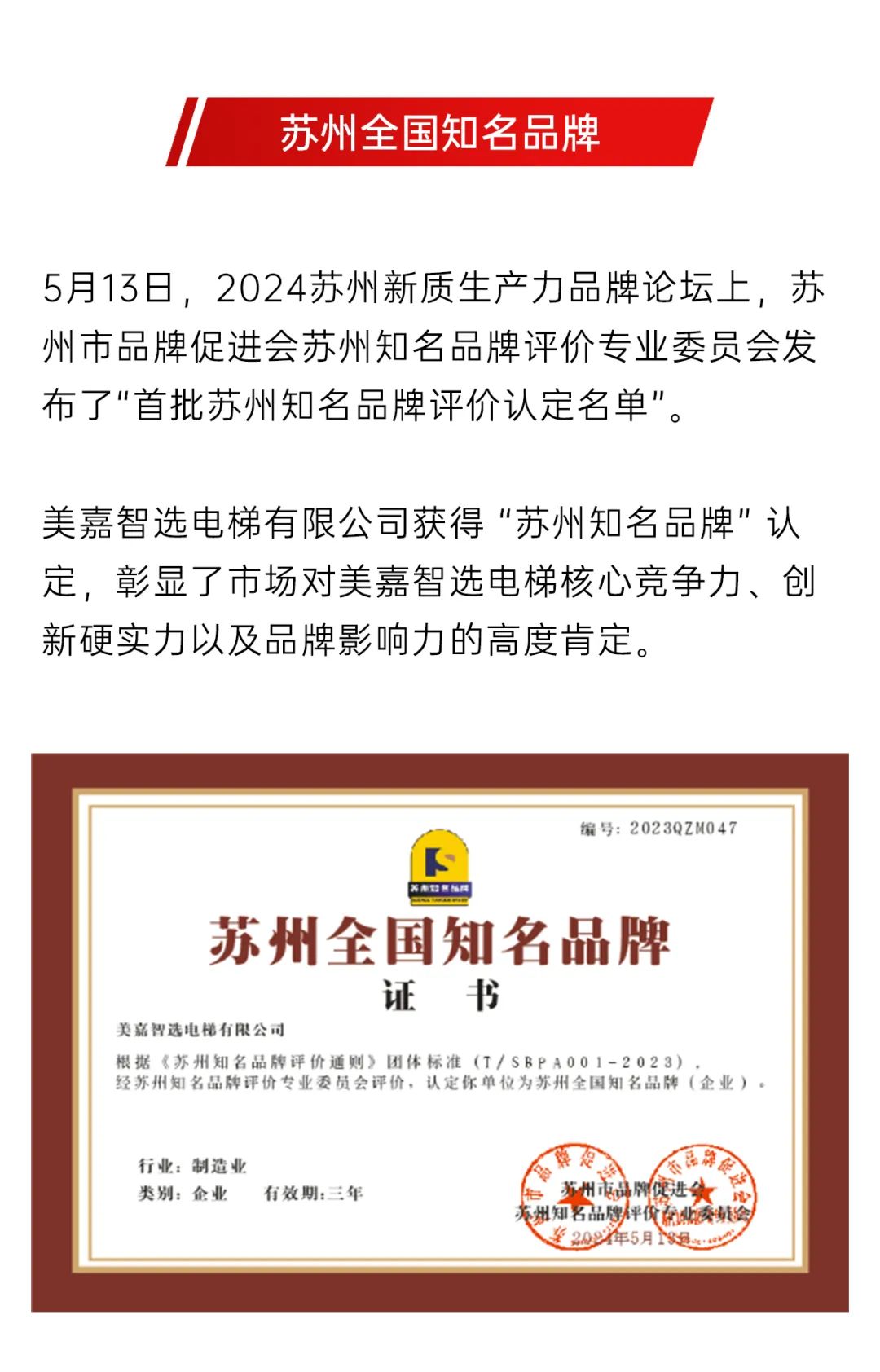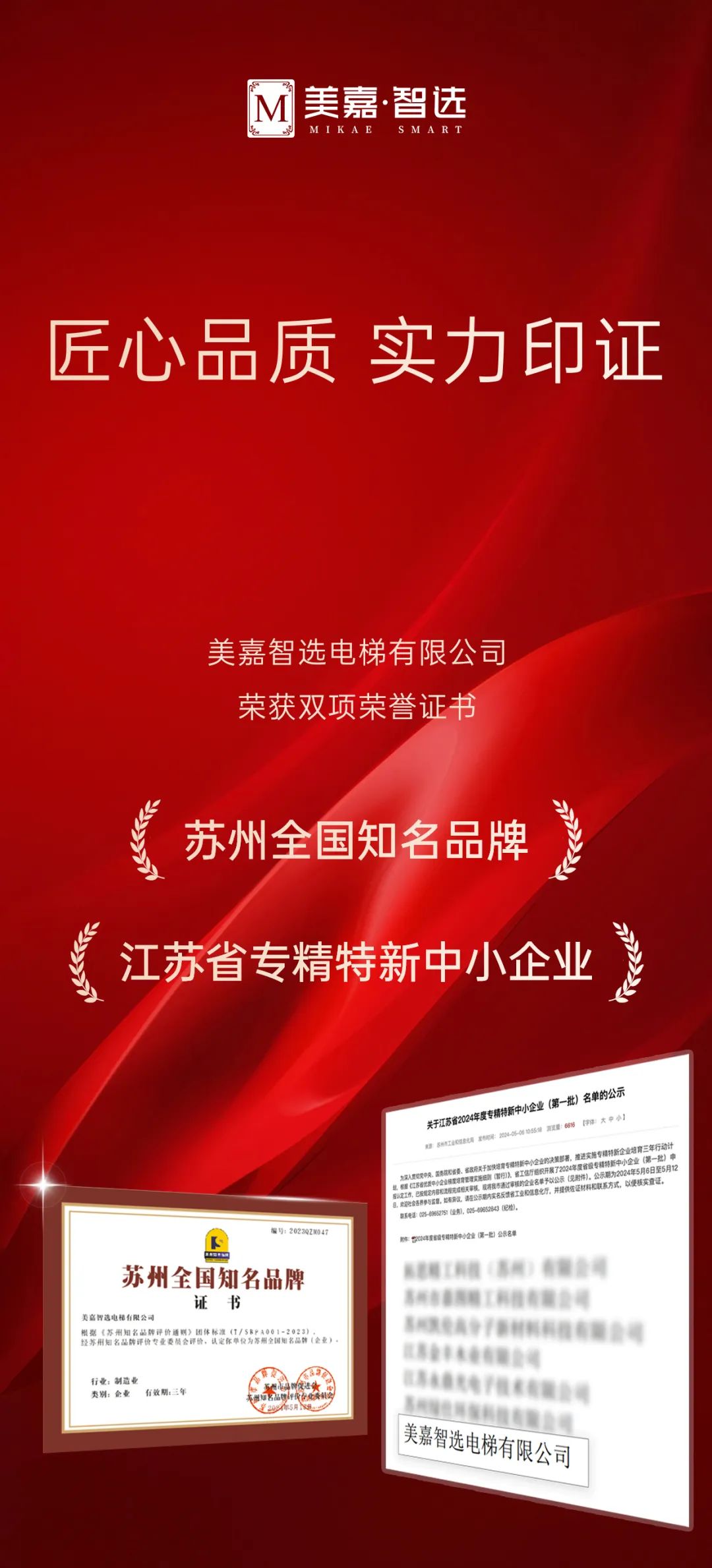 喜报|美嘉智选电梯荣获“苏州全国知名品牌”、“江苏省专精特新中小企业”双荣誉!