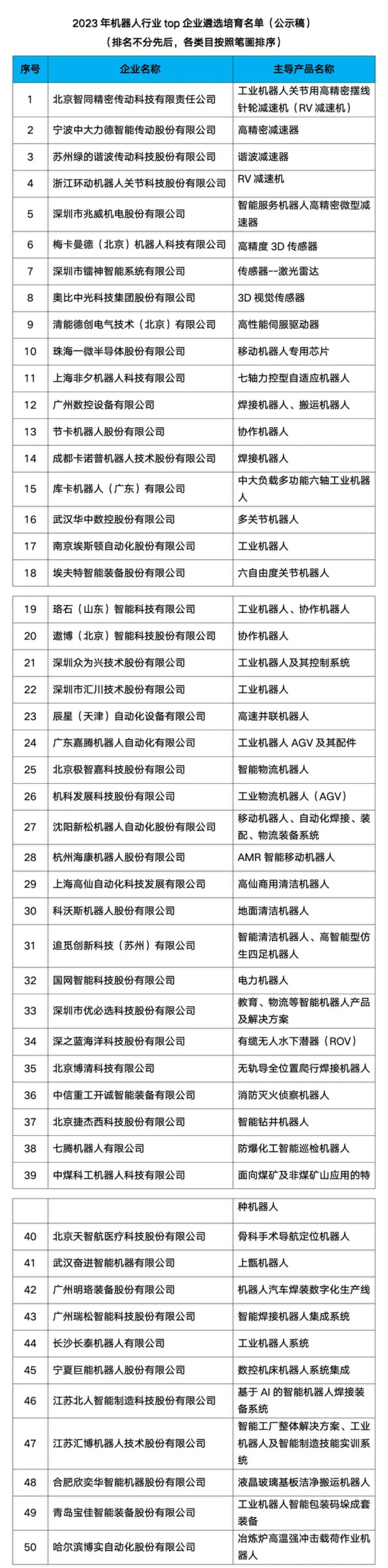 “天津机器人”是天津机器人产业协会的官方订阅号。关注我们,了解津内外、国内外机器人行业资讯。5月15日,由中国工业经济联合会、中国机械工业联合会、东莞市人民政府共同主办的“2024智能机器人技术与产业创新大会”主论坛在东莞召开。中国工程院院士谭建荣、俄罗斯工程院院士孙立宁、工信部装备工业一司二级巡视员苏葆莉,广东省工信厅副厅长陈磊、东莞市委常委副市长刘光滨、工信部装备工业一司智能制造处副处长郑坤、中国工业经济联合会党委书记执行副会长兼秘书长熊梦、中国机械工业联合会秘书长宋晓刚、中国医疗器械行业协会高级顾问、国家药品监督管理局医疗器械注册管理司原司长江德元等领导嘉宾参加大会。中国工业经济联合会执行副会长荣剑英主持会议。在大会上,中国机械工业联合会机器人分会发布了2023年机器人行业TOP企业遴选培育公示名单。“十四五”以来,在国家政策的大力支持和企业的共同努力下,我国机器人产业蓬勃发展,创新能力不断增强,涌现出一批具有竞争优势和发展潜力的优质企业。为贯彻落实 《“十四五”机器人产业发展规划》(工信部联规〔2021〕 206 号)要求,优化产业组织结构,培育和壮大具有生态主导力和核心竞争力的机器人优质企业,中国机械工业联合会机器人分会会同全国22家省市行业协会共同开展了机器人行业 TOP 企业遴选工作,旨在遴选出机器人行业创新能力强、在供应链发挥主导作用、在赋能经济社会数字化转型和支撑人民美好生活取得较好成果的企业,形成中国机器人行业 TOP 企业矩阵,并引导社会资源积极向TOP企业聚集。2023年机器人行业TOP企业遴选培育工作自2023年10月启动,共有近200家企业积极参与申报。按照遴选工作流程,经过企业申报、数据审核、评价委员会评审,共遴选出覆盖机器人零部件生产制造企业、工业/服务/特种机器人整机生产制造企业、机器人集成应用企业共50家。拟入选名单已公示,公示期为5月15日至6月15日。机器人行业 TOP 企业遴选培育工作每年开展一次,并建立动态管理机制,以形成一批支撑我国机器人产业高质量发展的主力军。同时,也将在中国工业经济联合会制造业单项冠军工作办公室的指导下,持续提高骨干企业发展质量与水平,引导企业不断向制造业单项冠军提升迈进。中国机械工业联合会机器人分会秘书处(010-85677807,cria@cmif.org.cn)部分内容来源于互联网,版权属于原作者。如构成侵权,请联系我们,我们将尽快处理。
