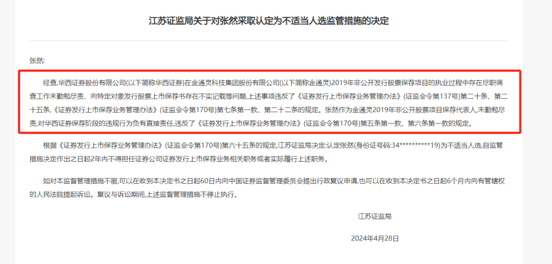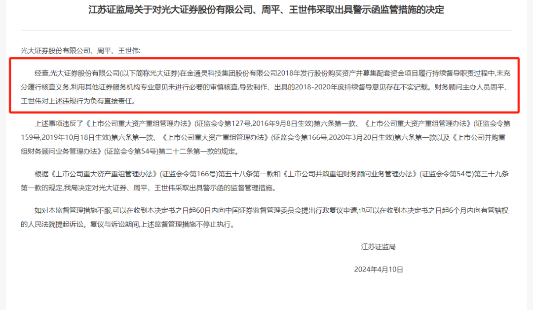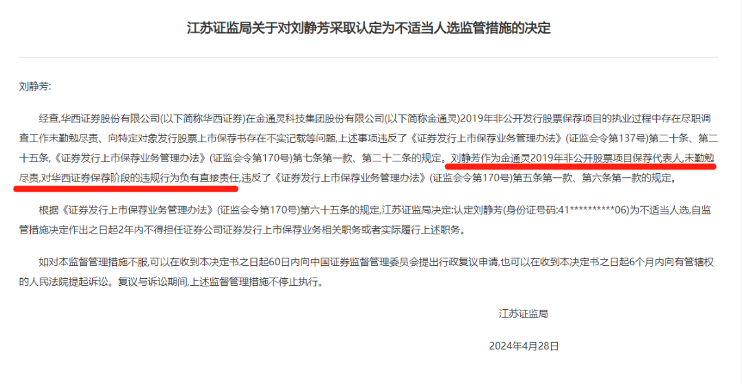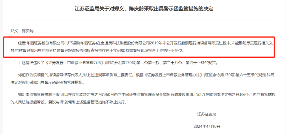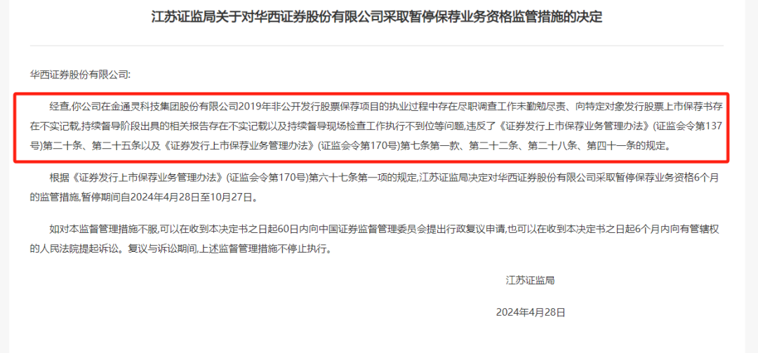 5月14日,江苏证监局连续发布多达7张券商罚单,相关罚单均与金通灵保荐督导业务有关,光大证券及公司财务顾问主办人员周平、王世伟被采取出具警示函措施,国海证券及项目持续督导保代林举、唐彬被采取出具警示函监管措施,华西证券的项目持续督导保代郑义、陈庆龄被采取出具警示函监管措施,华西证券被采取暂停保荐业务资格6个月,保代刘静芳、张然2年内不得担任证券发行上市保荐业务相关职务或者实际履行上述职务;东吴证券及项目负责人王秋鸣被采取出具警示函监管措施。