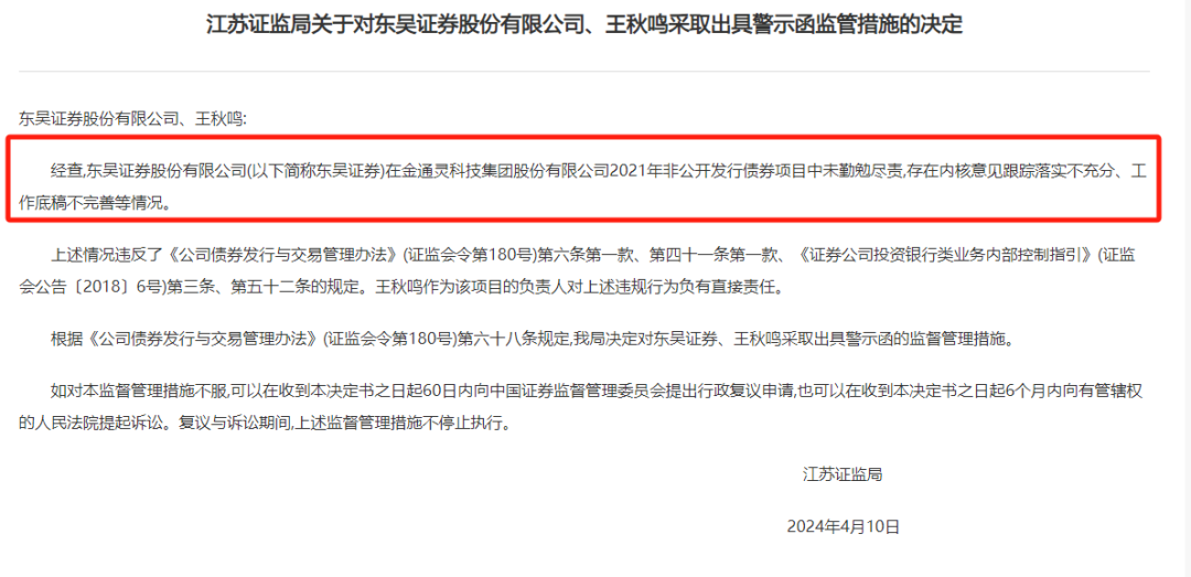 东吴证券在金通灵2021年非公开发行债券项目中未勤勉尽责,存在内核意见跟踪落实不充分、工作底稿不完善等情况。王秋鸣作为该项目的负责人对上述违规行为负有直接责任。