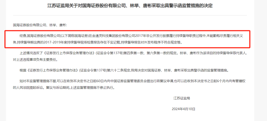 国海证券在金通灵2017年非公开发行股票履行持续督导职责过程中,未能勤勉尽责履行相关义务,持续督导期出具的2017-2019年度持续督导现场检查报告存在不实记载,持续督导报告对外发布程序不符合规定等。林举、唐彬作为该项目的持续督导保荐代表人,对上述违规事项负有主要责任。