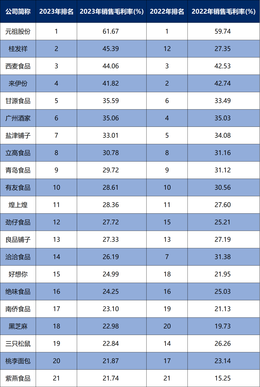 桂发祥:排名从2022年的第12位上升到2023年的第2位,名次上升了10位。销售毛利率从27.35%上升到45.39%,变动比例为65.97%。
