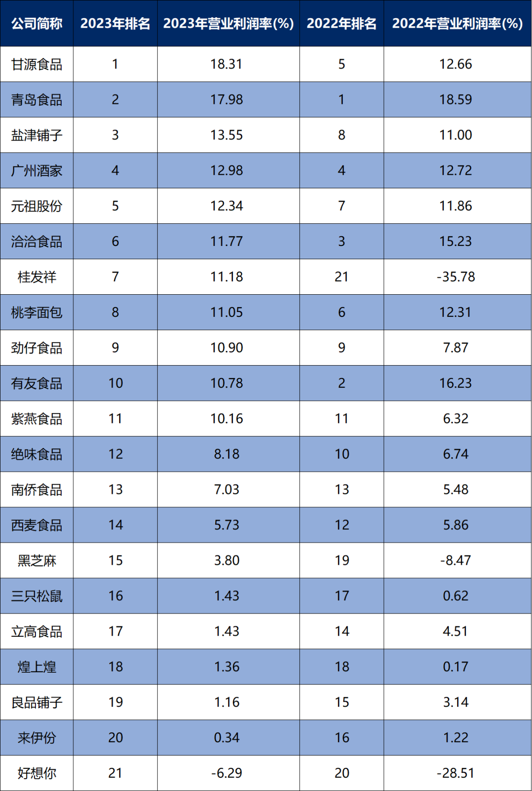 盐津铺子:名次提升了5位,2022年营业利润率为10.9964%,2023年为13.5489%,变动百分比为23.21%。