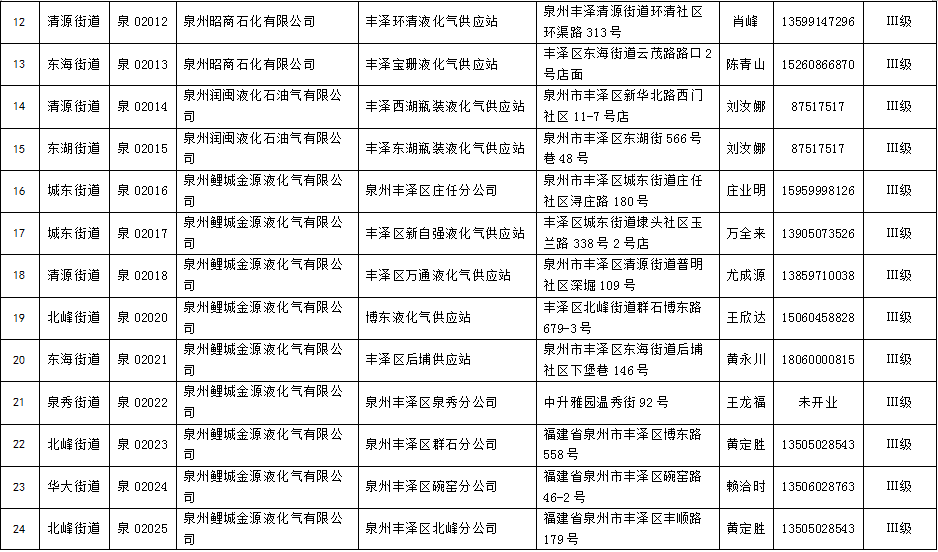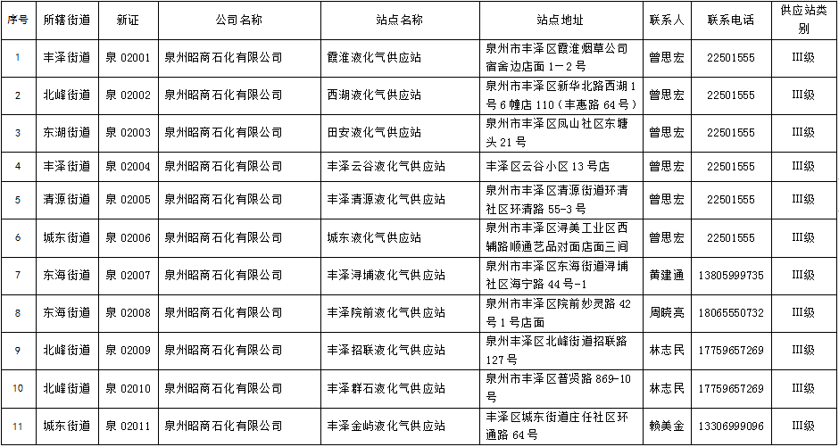 丰泽区瓶装燃气供应站点花名册