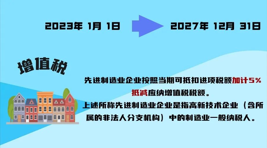 自2023年1月1日至2027年12月31日,允许先进制造业企业按照当期可抵扣进项税额加计5%抵减应纳增值税税额。