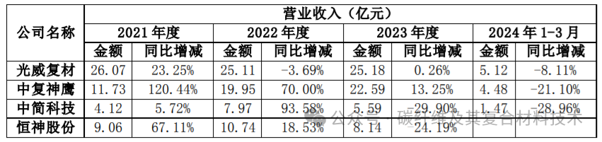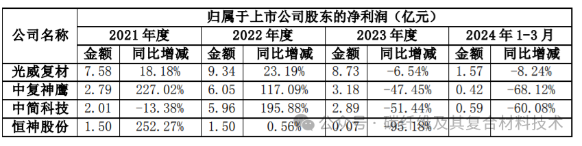 近日,威海光威复合材料股份有限公司(以下简称“光威复材”)发布了“ 关于对深圳证券交易所关注函回复的公告”,在该公告中总结了四家碳纤维公司近三年以及2024年第一季度营收和利润情况(见下表),根据统计数据显示,2023 年以来受宏观环境、下游需求放缓、行业竞争加剧、产品市场价格下降等因素影响,碳纤维行业公司均呈现不同程度的经营业绩下滑,行业短期面临较大的挑战。