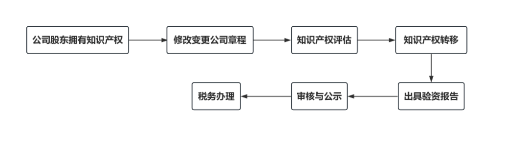 1.公司股东拥有知识产权。根据企业经营范围为股东提供知识产权,企业注册资本是属于股东出资义务,所以需要企业股东名下的知识产权才能实缴,知识产权的核心技术要与企业经营业务相关。2.修改公司章程。将原公司章程中的资金出资实缴变更为允许通过知识产权进行实缴,并进行工商备案。3.知识产权评估。按照专业的评估办法评估知识产权的价值,出具无形资产评估报告,并在中国资产评估协会备案。4.知识产权转移。将知识产权权属人从股东名下转移到公司名下。5.出具验资报告。需要由专业的会计师事务所、审计事务所及其他具有验资资格的机构出具验资报告。6.审核与公示。将相关审核资料,包括章程、无形资产评估报告、验资报告至企业所在地的工商局进行审核,审核通过后,实缴出资完成并会收到核准通知书。同时,公司的注册资本信息将会在国家企业信息公示网上进行公示。股东名下的知识产权完成实缴后,会转移到公司名下。7.税务办理。实缴完成后需到所在地税务局为股东办理纳税事宜。可选择办理递延纳税(如果出资属于专利技术(含国防专利)、计算机软件著作权、集成电路布图设计专有权、植物新品种权、生物医药新品种,以及科技部、财政部、国家税务总局确定的其他技术成果的,公司可以向税务部门申请递延纳税)。1. 根据《公司法》司法解释(三)第十五条规定,“出资人以符合法定条件的非货币财产出资后,因市场变化或者其他客观因素导致出资财产贬值,公司、其他股东或者公司债权人请求该出资人承担补足出资责任的,人民法院不予支持。”出资股东不对其后因市场变化或其他客观因素导致的贬值承担责任,公司也需要注意在出资前作出限制,要求出资人持续对知识产权出资进行维护,保证知识产权价值的存续。2.知识产权出资后作为公司资产,在后续公司存在债务风险时,知识产权可能被用以对外转让抵债。如果股东对出资的知识产权存在其他规划,需要提前摸清公司经营状况,避免出现知识产权被抵债的风险。3. 在以知识产权使用权出资的情况下,如果在使用权到期前公司破产,破产管理人可能会以等值于知识产权使用权剩余期限价值的出资尚未实缴的原由,要求出资股东按货币形式补齐出资。