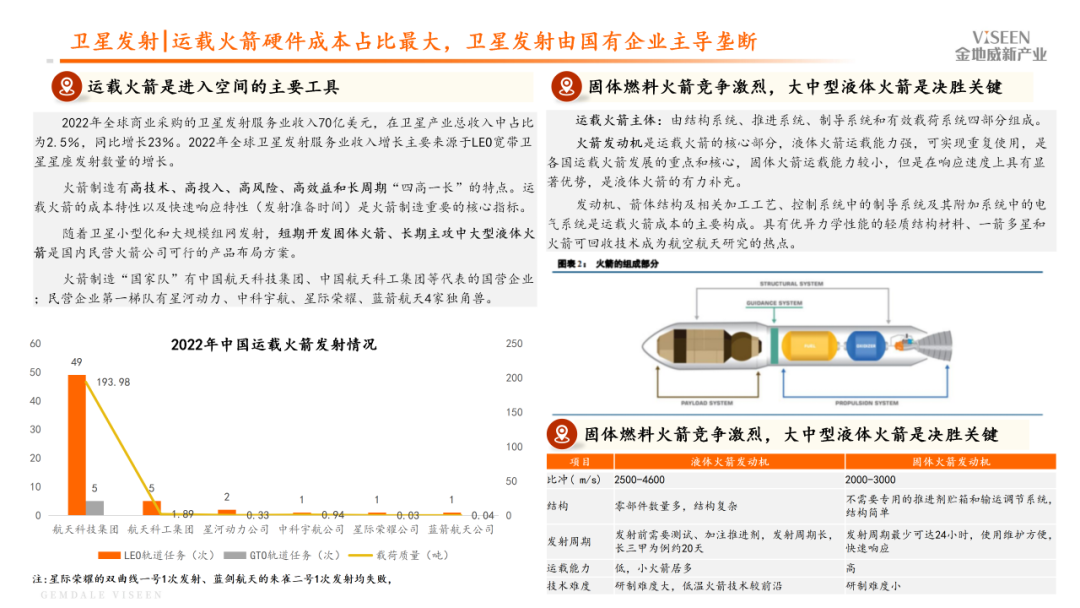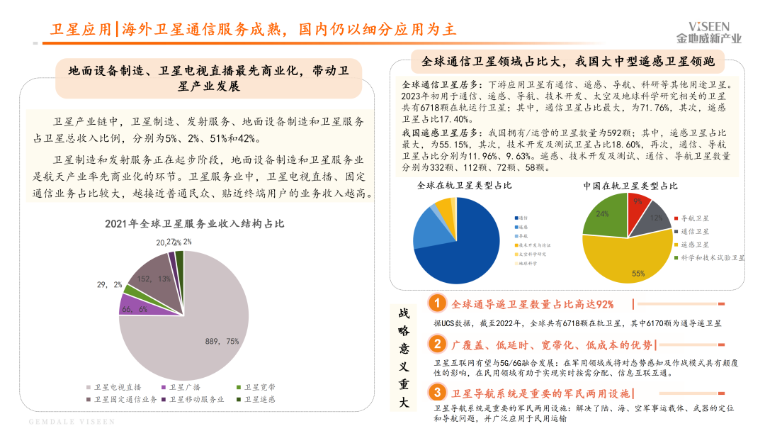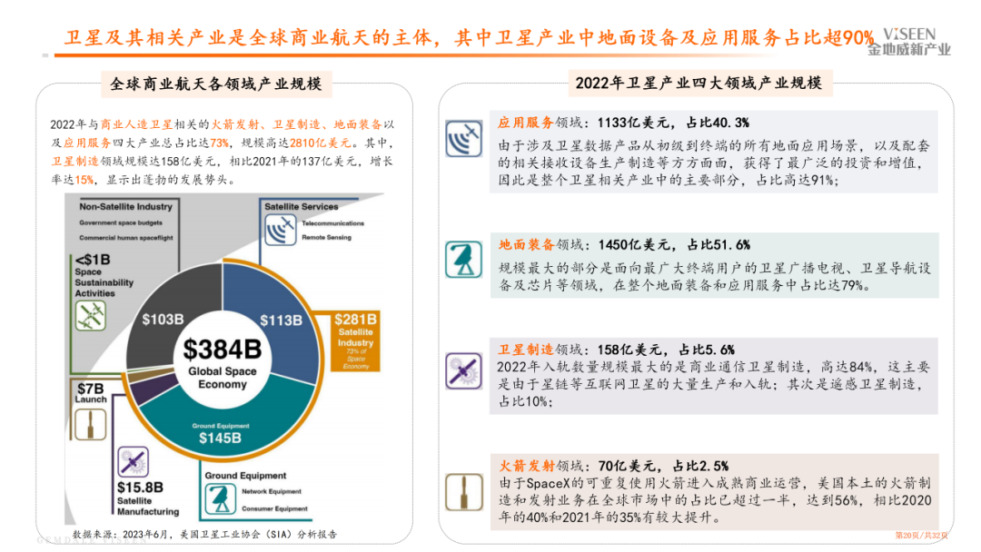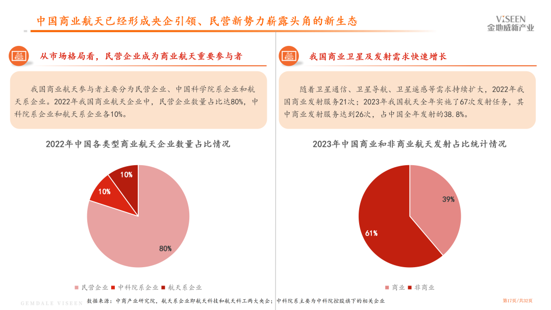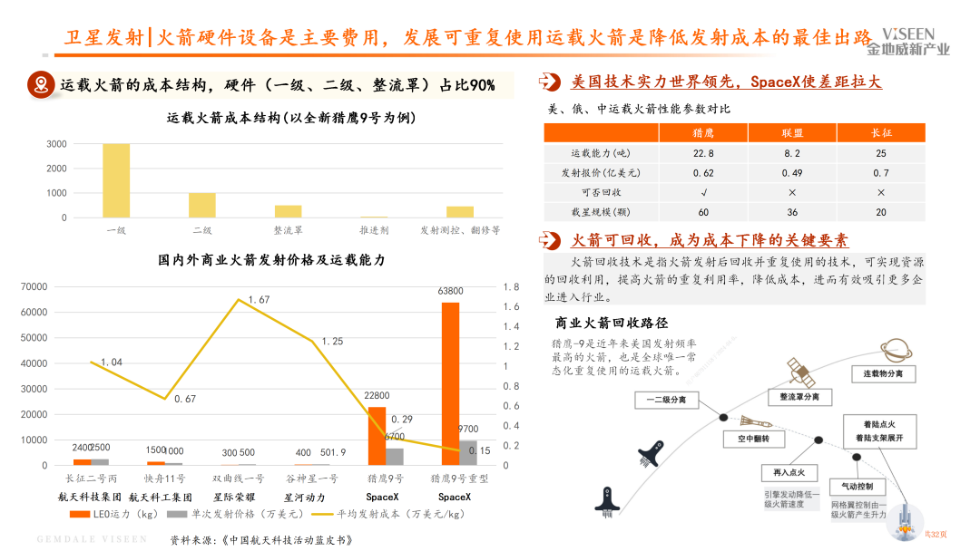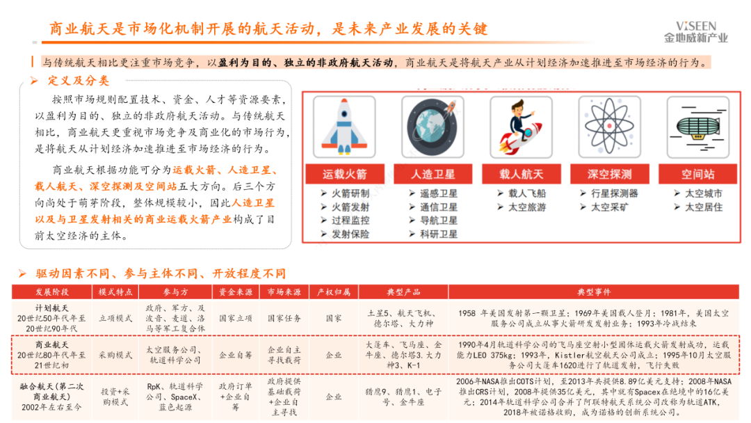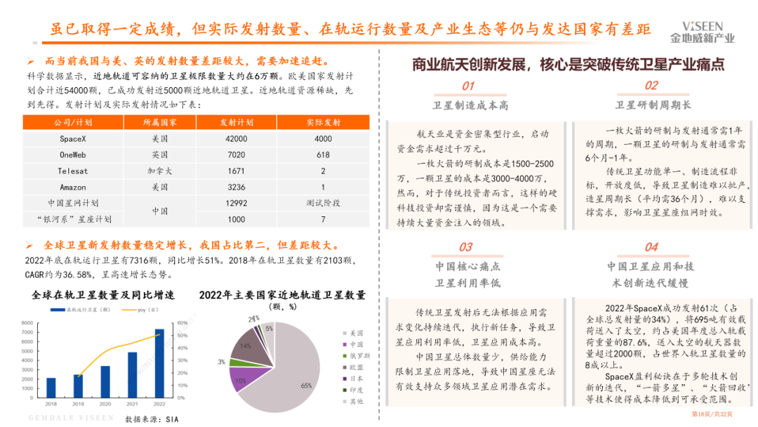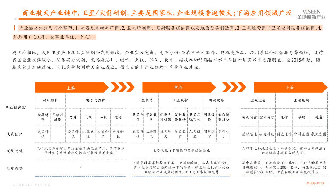 本期内容主要涉及商业航天的卫星互联网产业的研究热点。与传统的计划航天相比,商业航天更加注重市场竞争,是未来产业发展的关键之一,SpaceX的迅速崛起,更是带动了全球的商业航天发展·全球航天发射市场格局初步形成,欧美长期作为商业航天科技的领军者,市场份额常年保持在50%以上,但随着中国、印度等新兴航天大国的崛起,欧美卫星产业增速开始呈现降低的趋势·我国商业航天受政策推动迎来高速发展期,已取得一定规模,但在实际发射数量、在轨运行数量及产业生态等方面仍与发达国家有差距·卫星及其相关产业是全球商业航天的主体,尤其是低轨卫星,轨道和频段资源的稀缺(先占先得)使其在全球范围内掀起建设热潮·在产业链中,卫星/火箭研制,投入大、技术高,企业实力较强;下游应用主要以通信、遥感、导航居多。