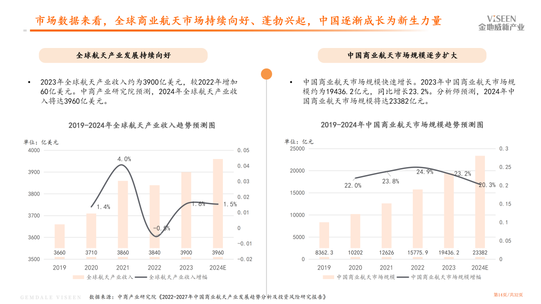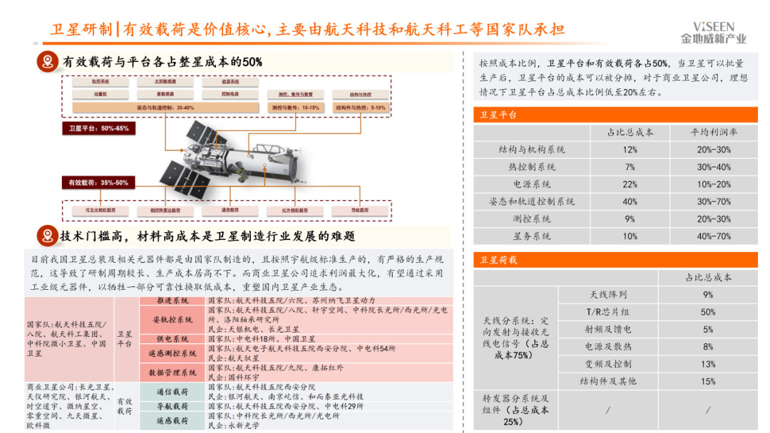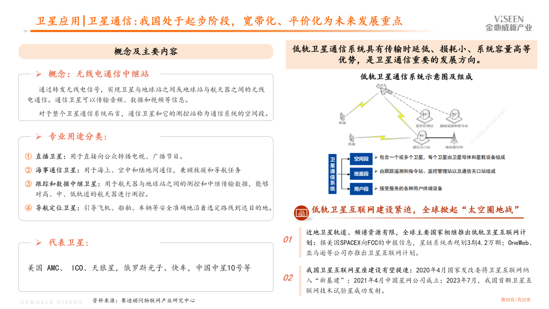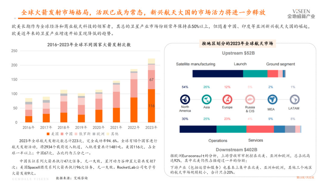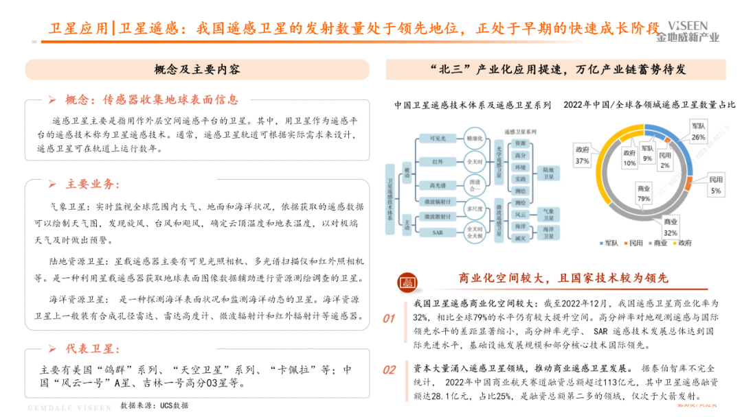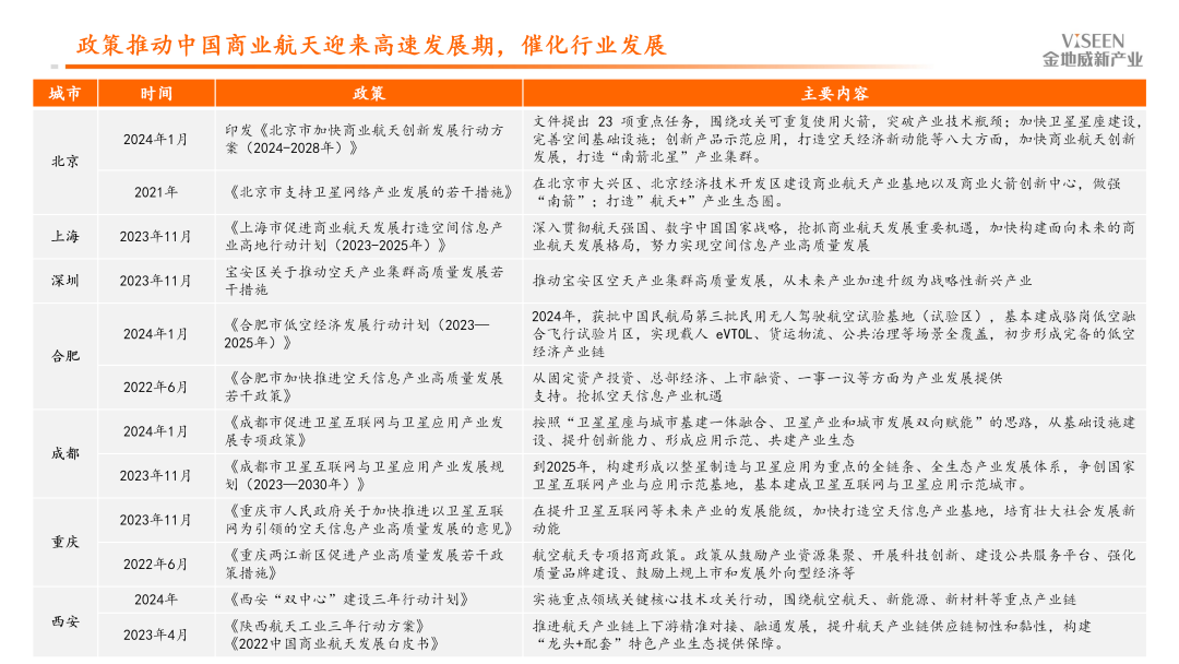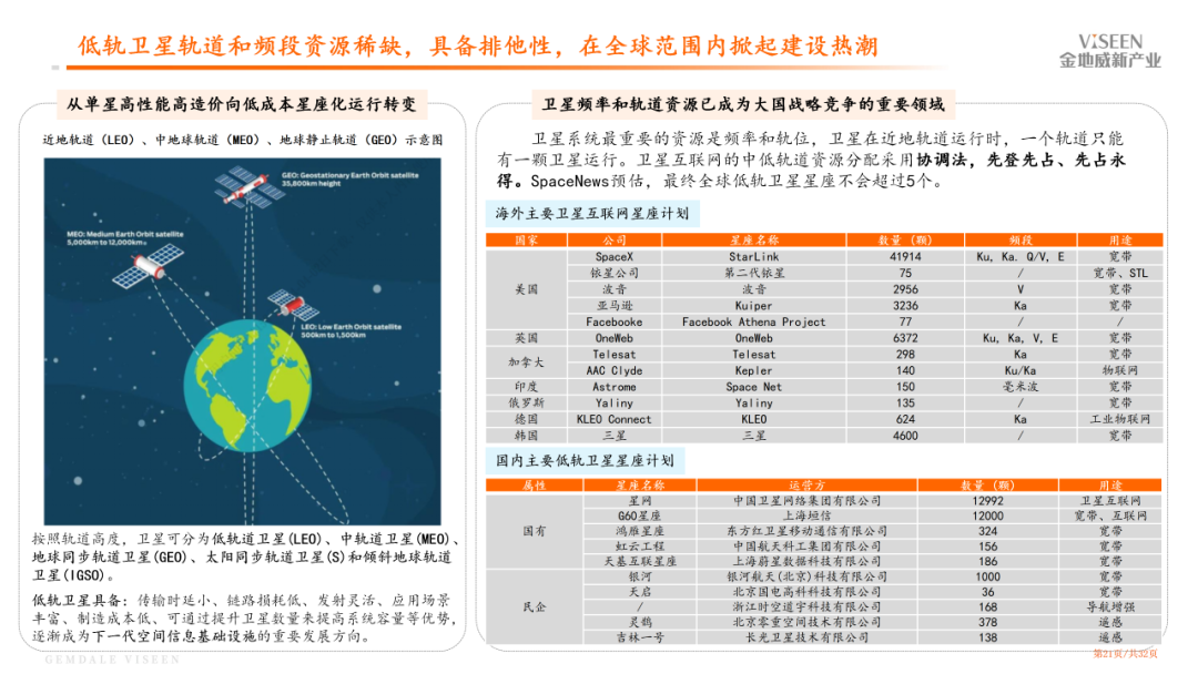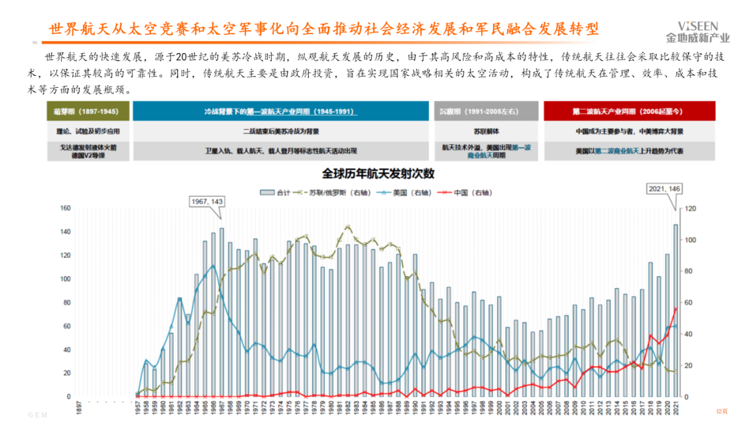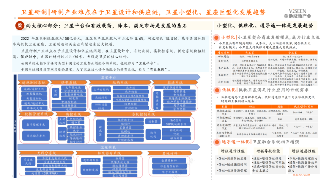 本期内容主要涉及商业航天的卫星互联网产业的研究热点。与传统的计划航天相比,商业航天更加注重市场竞争,是未来产业发展的关键之一,SpaceX的迅速崛起,更是带动了全球的商业航天发展·全球航天发射市场格局初步形成,欧美长期作为商业航天科技的领军者,市场份额常年保持在50%以上,但随着中国、印度等新兴航天大国的崛起,欧美卫星产业增速开始呈现降低的趋势·我国商业航天受政策推动迎来高速发展期,已取得一定规模,但在实际发射数量、在轨运行数量及产业生态等方面仍与发达国家有差距·卫星及其相关产业是全球商业航天的主体,尤其是低轨卫星,轨道和频段资源的稀缺(先占先得)使其在全球范围内掀起建设热潮·在产业链中,卫星/火箭研制,投入大、技术高,企业实力较强;下游应用主要以通信、遥感、导航居多。