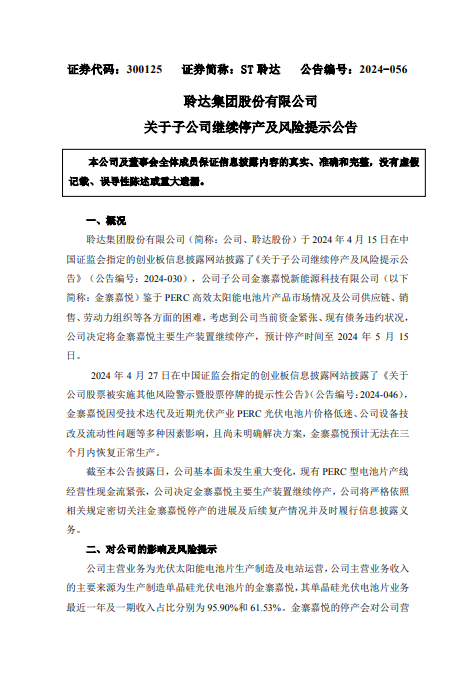 可以想象到,全产业链塌方式的跌价,各个制造环节都处于亏损状态。相关企业产线开工即亏损,停工损失还能小一些。这样的市场行情也导致ST聆达(300125)旗下金寨嘉悦新能源继续停产。
