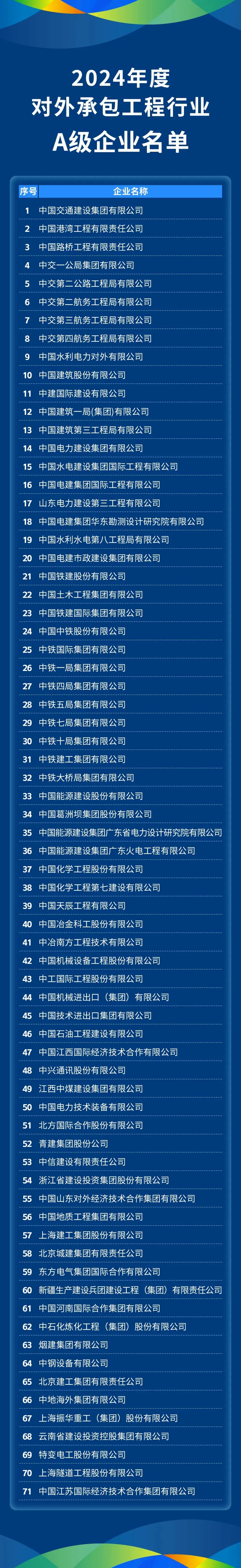 71家企业在榜!2024年度对外承包工程行业A级企业名单揭晓