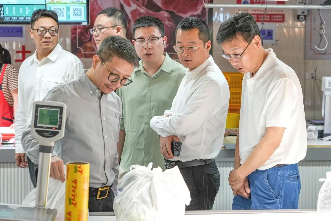 橙柿农贸市场为考察第二站。一鸿市场集团董事长吴刚向参观成员介绍了市场的基本情况,双方就场内的日常经营管理、智慧设备的使用情况交流意见。