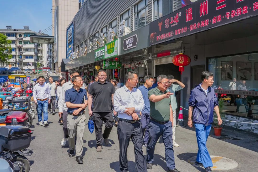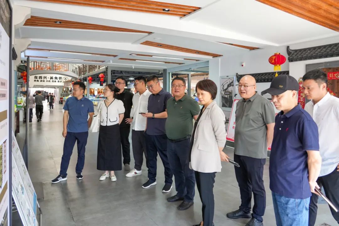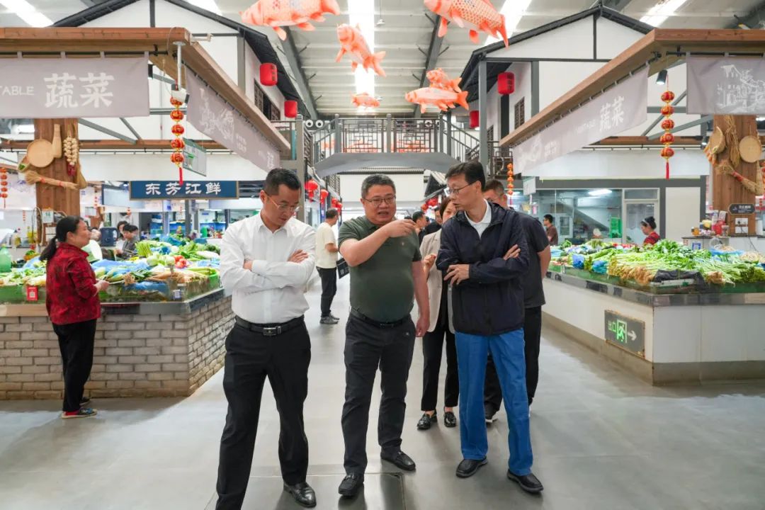 西兴农副产品综合市场为考察第一站。参观成员现场咨询西兴农副产品综合市场的日常运营模式,了解市场的改造规划情况,并对其设计风格表示认可。