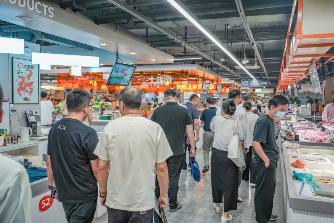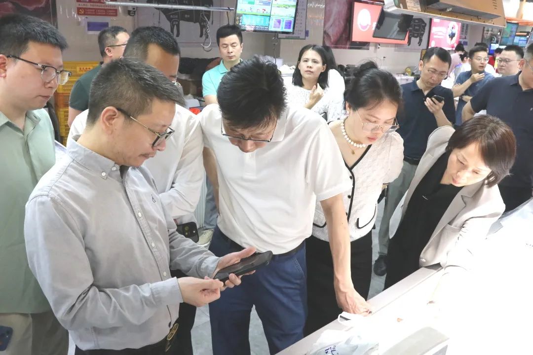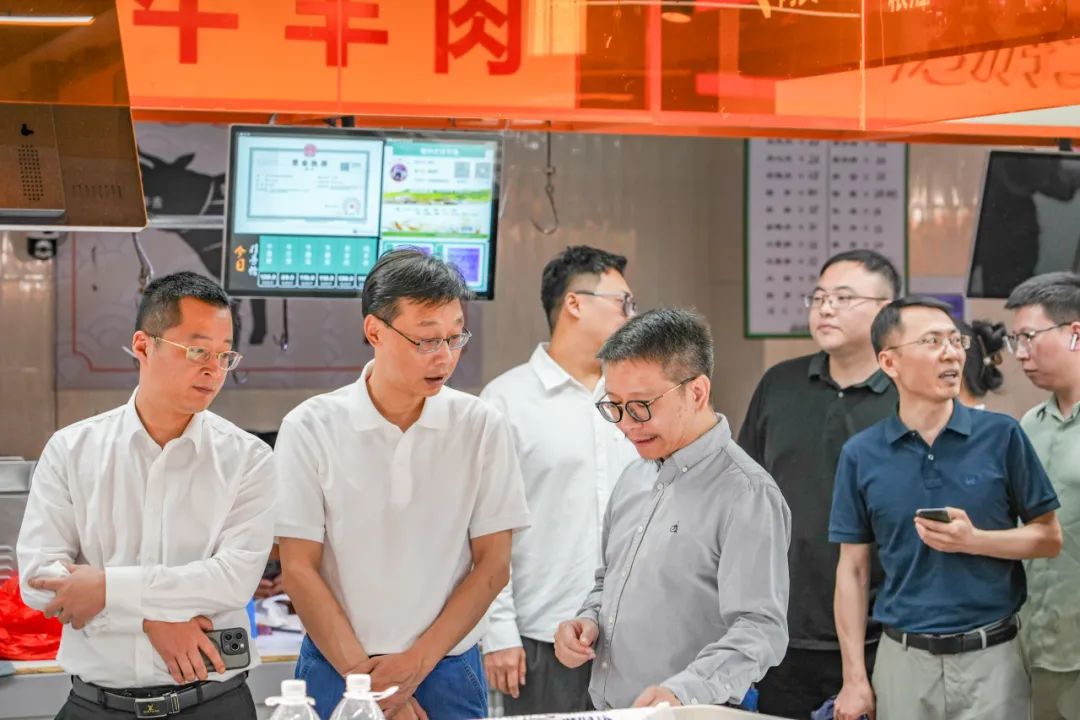 吴刚向参观成员着重介绍了橙柿农贸市场的“饿了么阳光菜场”平台,通过共享供应链、社区前置仓、即时履约服务的能力整合,搭建出资源、数据、利益共享的菜篮子生态平台。推动商家加速数实融合,更好地满足每个消费者所处社区的即时需求。