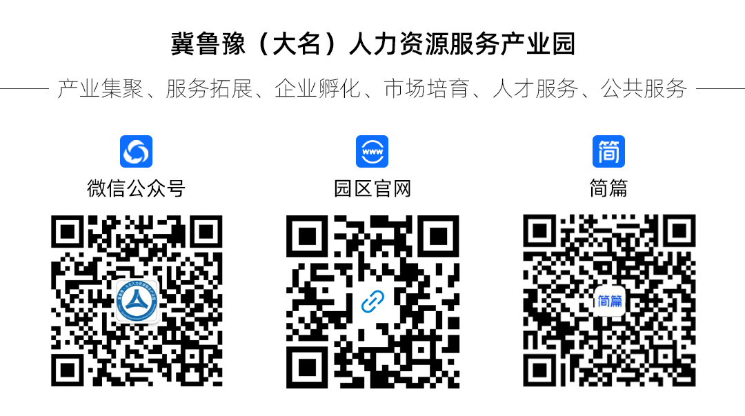 冀鲁豫(大名)人力资源服务产业园位于邯郸市大名县京府大街362号行政服务服务中心4-5层,园区采取“政府主导、行业引导、市场化运营”的模式,围绕 “人力资源服务高地”总目标,突出“产业集聚、服务拓展、企业孵化、市场培育、人才服务、公共服务”六大功能定位,构建人力资源服务新业态和新模式,全力打造“立足大名、服务邯郸、辐射河北、链接冀鲁豫”的多层次、多元化、专业性的全人力资源服务行业生态圈。