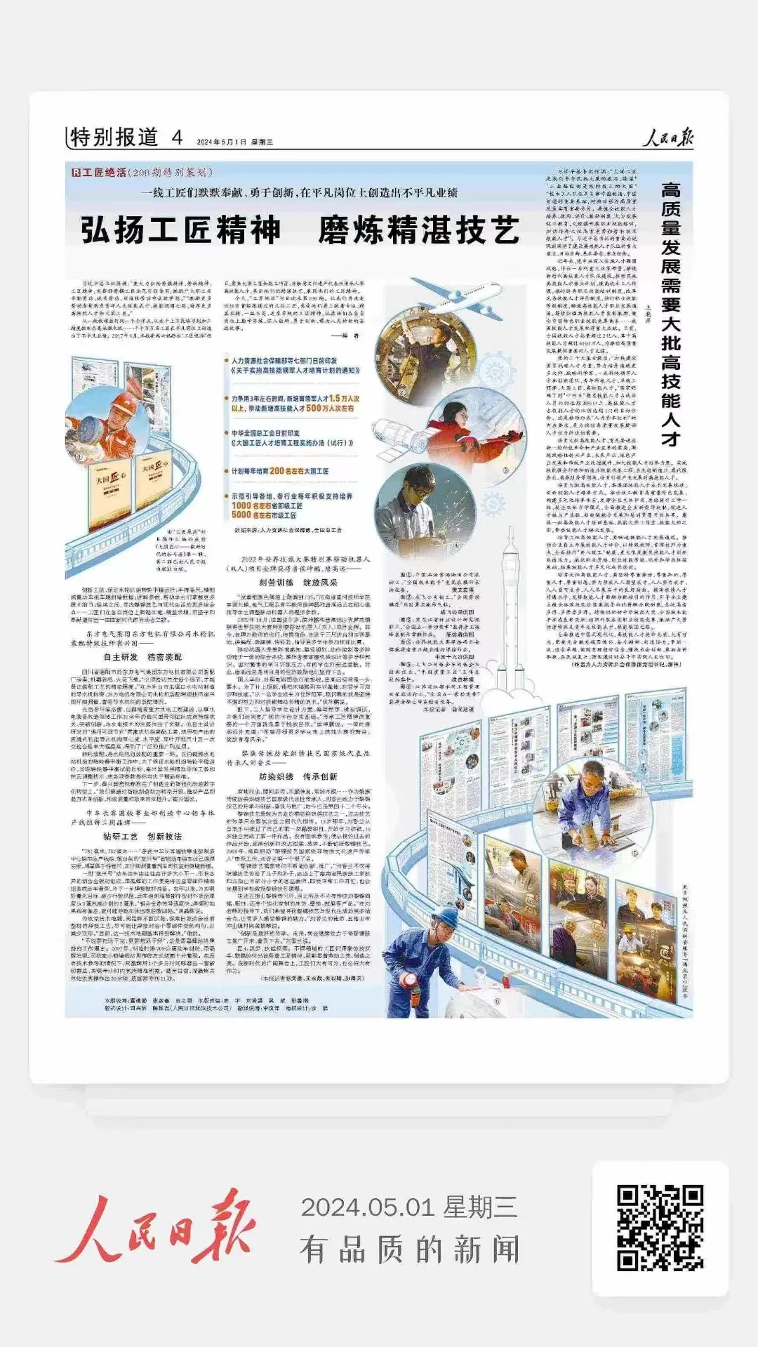 全面推进中国式现代化,高技能人才使命光荣、大有可为,需要充分激发报国情怀、奋斗精神、创造活力,争创一流、追求卓越,做到有理想守信念、懂技术会创新、敢担当讲奉献,在民族复兴、强国建设的奋斗中实现人生出彩。