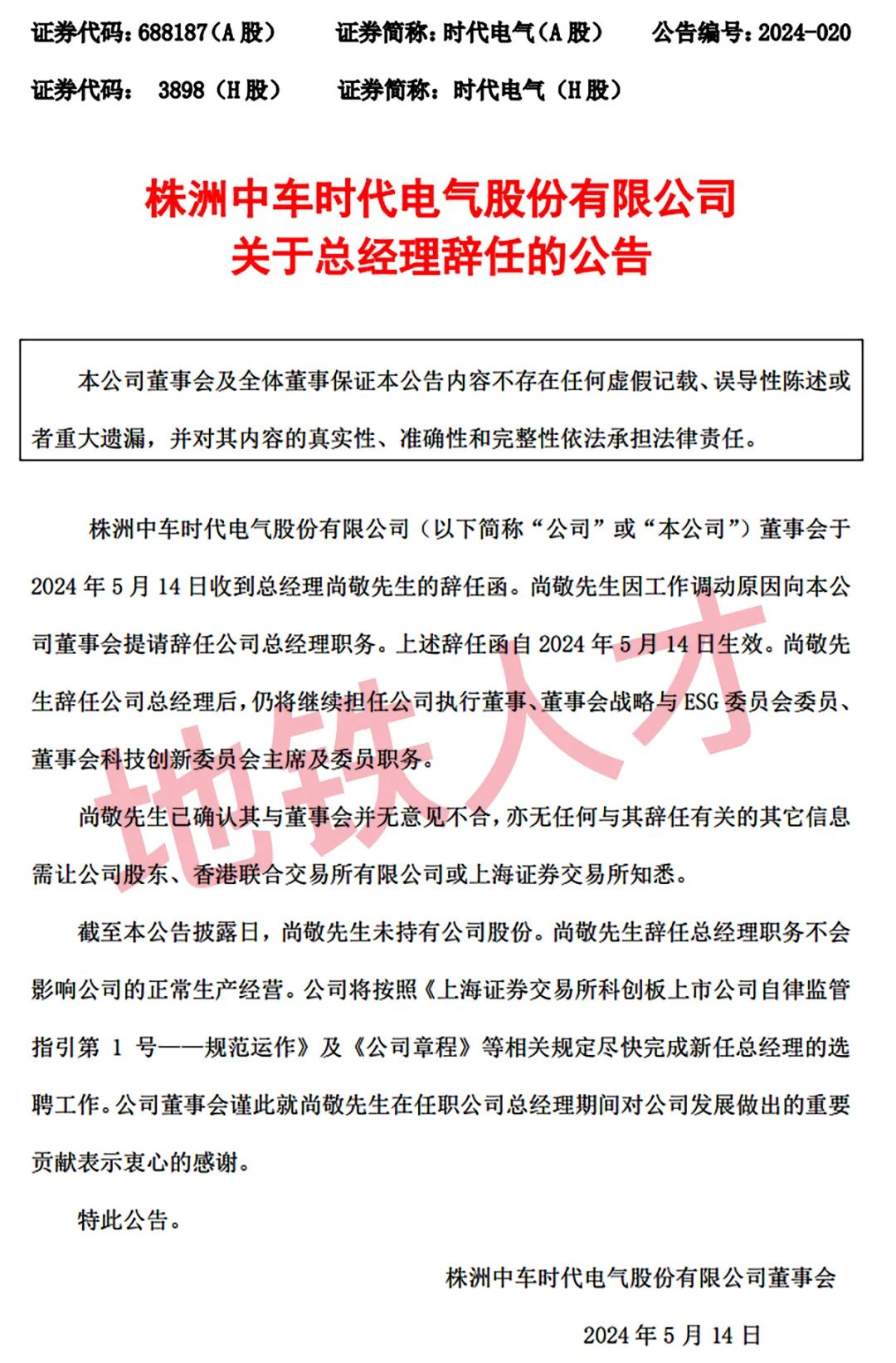 株洲中车时代电气股份有限公司(以下简称“公司”或“本公司”)董事会于2024 年 5 月 14 日收到总经理尚敬先生的辞任函。尚敬先生因工作调动原因向本公司董事会提请辞任公司总经理职务。上述辞任函自 2024 年 5 月 14 日生效。尚敬先生辞任公司总经理后,仍将继续担任公司执行董事、董事会战略与 ESG 委员会委员、董事会科技创新委员会主席及委员职务。