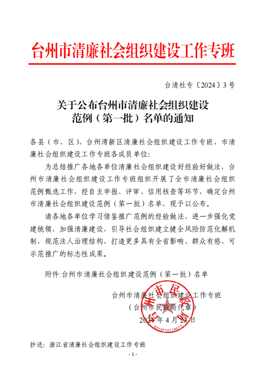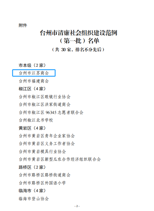 热烈祝贺台州市江苏商会入选台州市清廉社会组织建设示范例(第一批)名单