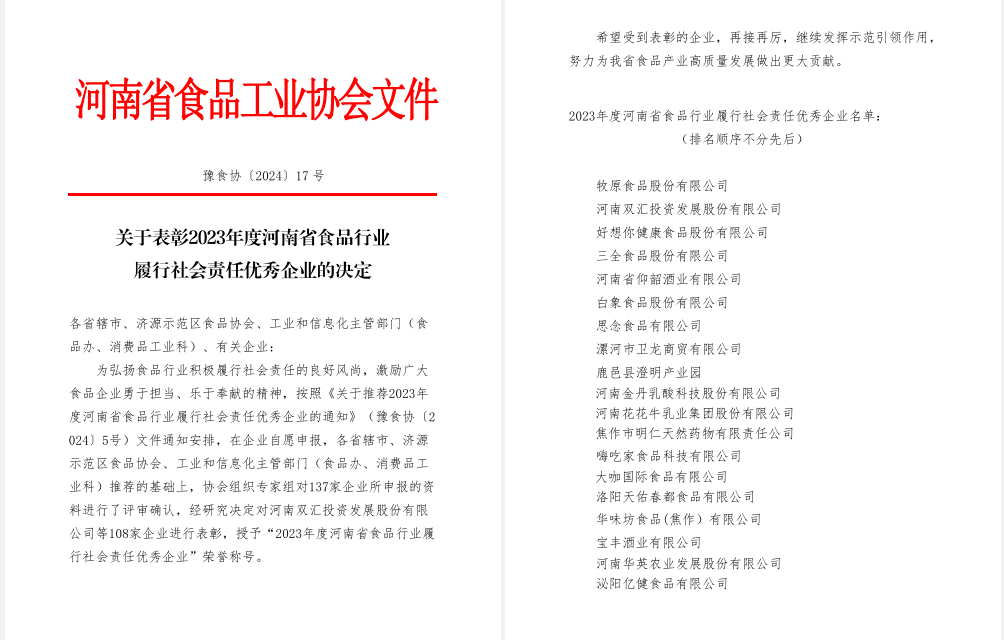 05月15日,河南省食品工业协会发布关于表彰2023年度履行社会责任优秀企业的表彰决定,旨在弘扬行业正气,表彰那些在食品安全、环境保护、社会责任践行等方面做出显著贡献的企业,进一步激发全行业积极履行社会责任的热情与动力。经过严格的评审流程,共有108家食品企业脱颖而出,被授予“2023年度河南省食品行业履行社会责任优秀企业”这一殊荣,河南链多多供应链管理有限公司凭借其在社会责任领域的杰出表现,荣登榜单!