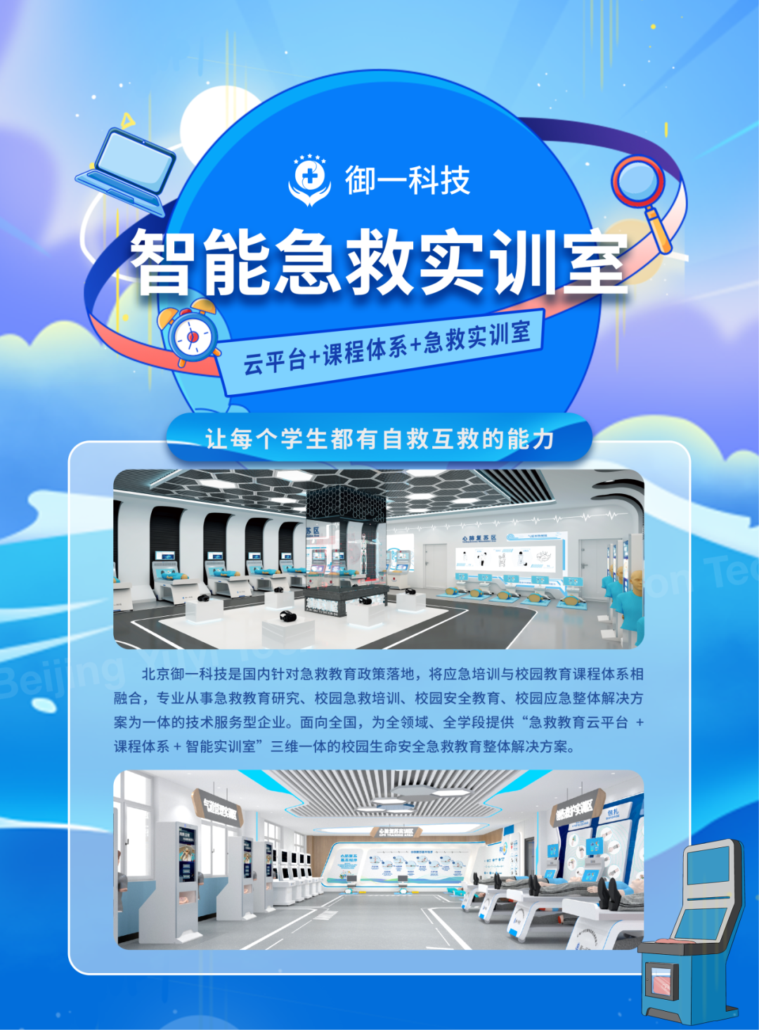 北京御一科技信息技术有限公司(以下简称北京御一科技)是一家从事急救教育智能数字化平台开发、急救教育课程开发、急救教育装备研发、公众急救培训、企事业单位安全教育平台建设的科技型企业,以“科技+急救+教育”为主体形式,向客户提供各类急救科普教育产品和服务。公司以“让每个学生都有自救互救的能力”为使命,快速响应国家相关政策,基于数字云平台构建人联、物联、智联的急救教育体系,助力学校面向师生普及急救知识和技能,提高校园应急救护能力,切实保障青少年生命健康。