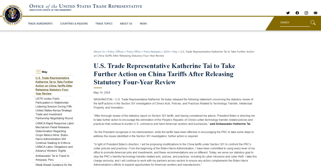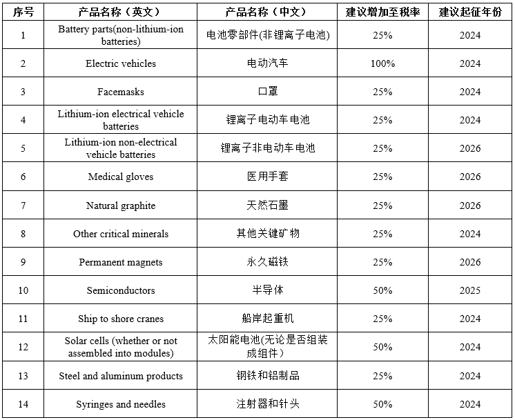 当地时间2024年5月14日,美国贸易代表办公室(USTR)发布对华加征301关税四年期复审结果,建议在原有对我国征收301关税基础上,进一步加征自我国进口的电动汽车、锂电池、半导体、光伏电池、港口起重设备等共14类产品的301关税,新的关税幅度将增加至25%至100%不等。