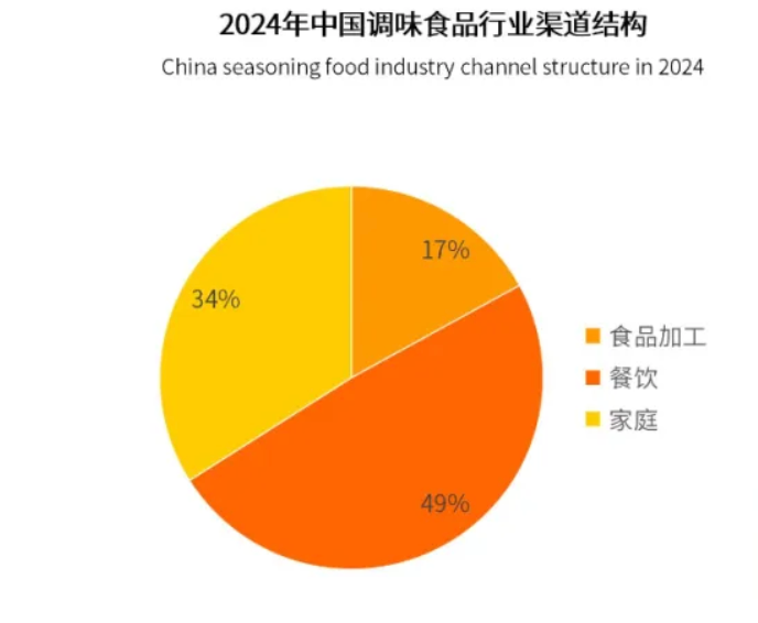 调味品下游消费主要由餐饮、家庭、食品加工三大类需求构成,2024年三类终端销量占比分别为49%/34%/17%。