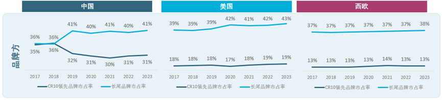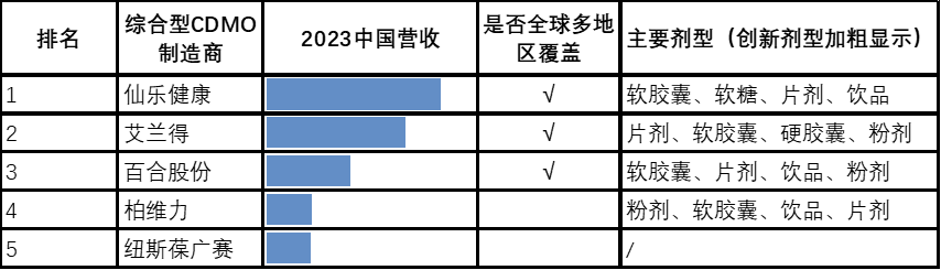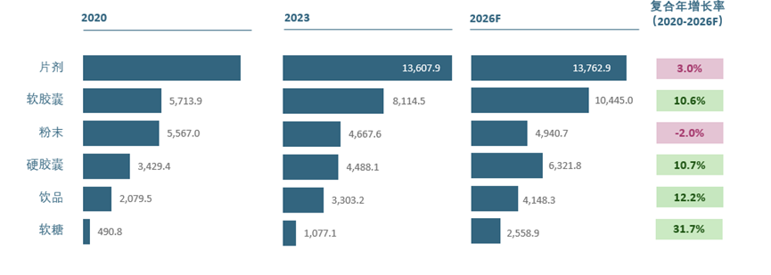 与此同时,年轻人逐渐成为营养健康食品市场的重要增长极。由央视、国家统计局、中国邮政联合发起的《中国美好生活大调查》数据表明:2023 年,18-35 岁年轻人的消费榜单前三位是旅游(32.77%),电脑、手机等数码产品(31.67%)和保健养生(31.04%)。工作压力大、作息不规律的年轻人,将营养健康食品作为辅助健康的重要手段。而年轻群体普遍较高的科学素养、对新鲜事物较高的需求和接受度,预计将推动营养健康食品市场更重视科技创新、优质产品,以满足他们更丰富的细分需求。图表五:各年龄段消费人群每日摄入膳食营养补充剂的频率[6]为了触及更广泛的人群,营养健康食品行业也在不断做出创新,各种产品形态不断涌现,以满足不同人群的健康需求和服用偏好。传统剂型方面,软胶囊、硬胶囊在占据较多市场份额的同时,依然保持较高的复合年增速;创新剂型方面,饮品、软糖越来越受到年轻消费者的青睐,尤其是软糖类食品的外观口味、休闲化的服用体验均推动了该剂型的爆发式增长。无论是胶原蛋白肽、益生菌、叶黄素酯、还是葡萄糖,众多新式成分都可以融入软糖剂型中,通过创新剂型搭载创新成分,叠加美味的食用体验,鼓励年轻一代加入营养健康食品的消费。图表六:2020-2026年中国营养健康食品各剂型产品的零售额(单位:百万美元)[7]从功能细分来看,免疫力/精力提升体量规模最大,是行业上下游企业研发生产的重心之一;人口老龄化带动了心脑健康和代谢的高双位数增长;而随着养生愈发年轻化,抗衰、益生菌与肠道健康功能呈现强劲增长态势。综合剂型和功能的细分,可以看出消费者对于科学功效和新型剂型的需求在不断升级,这对行业的创新发展提出了更高的要求:需要行业上下游持续保持创新活力,通过原料创新、剂型技术创新和渠道创新来推动和维持行业的韧性增长。图表七:2020-2026年中国营养健康食品各功能品类的零售额(单位:百万美元)[8]营养健康食品零售终端的韧性发展离不开中上游产业的稳定供应和生产技术支持。在营养健康食品生产制造方面,上游原料供应的一大关键趋势是持续增强可持续性和透明度,行业越来越重视道德采购和采购对环境友好的原料。而作为中游的生产制造商,则逐渐成为提供产品开发、营销以及建立消费者信任的关键。生产制造商们通过产品创新、质量保证和建立品牌声誉,持续推出热门品类、塑造市场趋势,并影响消费者的购买决定。其中,代工生产制造成为行业内越多品牌选择的生产模式。其稳定的商业模式、强大的研发生产能力以及深入的国际化服务,可以持续为品牌方提供优质产品和服务,从而稳定地获取客源,实现韧性增长。回顾营养健康食品市场竞争格局的变化情况,2023 年零售端头部前十营养健康食品品牌市占率约为 31%,该数字从 2017 年起呈现缓慢下滑的态势。整体市场长尾效应明显,且中小品牌及新锐品牌的零售额占比持续上升。零售端格局的变化同样影响并折射中上游生产制造端的格局波动。一方面,通常小型及新锐品牌多为轻资产模式,缺乏自研自产能力,更倾向将研发生产交由代工生产商完成,代工生产模式预计将获得更多的市场份额。另一方面,在竞争加剧的市场格局下,零售端中大型品牌对代工生产商的资质、研发和生产能力提出更高要求,代工生产行业预计将进一步向头部集中,更具技术创新、规模优势的企业将获得更高的市场份额。图表八:C端品牌CR10与长尾品牌市占率2017-2023年变化[9]深入解析代工生产制造商,中国本土头部企业正不断推动产业链升级,以其综合性的全球化服务覆盖抢占市场机遇。这种全球化布局包括本地化生产或设立临海制造基地,不仅回应了供应链全球化的需求,也利于敏捷响应当地消费市场的即时趋势。在该背景下,中国营养健康食品市场的稳健发展和中国营养健康食品代工生产商的全球化扩张相得益彰,共同推动头部企业在全球范围内参与国际化竞争。虽然海外也有当地的专业制造商,但这些生产制造企业大多服务于本土市场,而且专注于单种营养健康食品品类或剂型,譬如欧美本土的 CAPTEK、Eurocaps 专注于软胶囊,VitaQuest 则专注于片剂生产。而在目前中国主要代工生产制造商中,仙乐健康以约 2.5 亿美元的中国市场营收占据头部地位,并凭借全球多地区覆盖布局、主攻软胶囊及软糖等高市场增速剂型的优势,持续巩固其市场地位。图表九:2023年中国CDMO竞争格局[10]