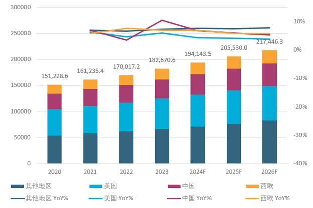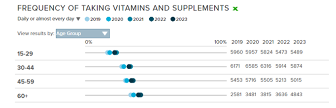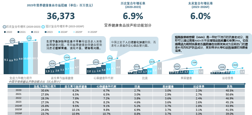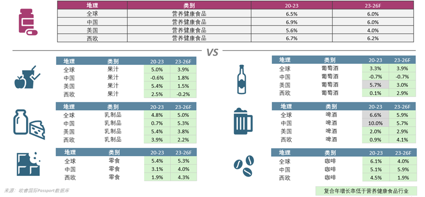 回顾 2023 年《政府工作报告》[1]:面对异常复杂的国际环境和艰巨繁重的改革发展稳定任务,全年经济社会发展主要目标任务圆满完成;经济总体回升向好,国内生产总值超过 126 万亿元,居民消费价格上涨 0.2%。除教育及其他日常开销外,健康与医疗服务的人均开支处于高双位数增长。首先,从 GDP 增速同营养健康食品行业增速对比来看,无论是中国、美国还是日本,营养健康食品行业的增速基本没有受到经济波动的影响而大幅波动。相反,该行业从 2013 年至 2023 年的十年间均保持了相对稳健的高增长。其次,在同等受到市场环境挑战和压力下,营养健康食品行业表现出了相较于其他零售行业更快且更健康的发展韧性。图表二:2013-2023重点市场GDP增速与营养健康食品行业增速对比[3]图表三:营养保健食品市场增速vs.其他零售行业,2020-2026[4] 根据欧睿本次研究定义,营养健康食品由维生素与膳食补充剂、运动营养和体重管理品三大品类组成,其中维生素及膳食补充剂市场规模占整体超 70%,增速稳健;运动营养虽然增速最快,但品类整体偏低端化竞争;体重管理由于效果非及时显著,近年增速持续低迷。图表四:2020-2026年全球及主要国家/地区营养保健食品市场规模[5] 在《健康中国2023》大方针推动下,消费者对于预防性健康保健的意识在不断提升。即便在人口结构变化的当今中国社会,营养健康食品作为全年龄段的补充剂依旧能够稳获增量空间。不断增长的老年人群体是营养健康食品消费的稳固基本盘。中国 65 岁以上的老龄人口每年都在高速增长,2023 年至 2026 年期间中国老年人口的年复合增长率增长 2.6%。随着近年老龄人口预防保健意识的逐步升级,他们表现出了对营养健康食品更为重视的消费心态和更日常化的服用习惯。根据欧睿消费者调研,从 2019-2023 年,60 岁以上老龄人口每日服用维生素及膳食补充剂的人数占比有明显提升。