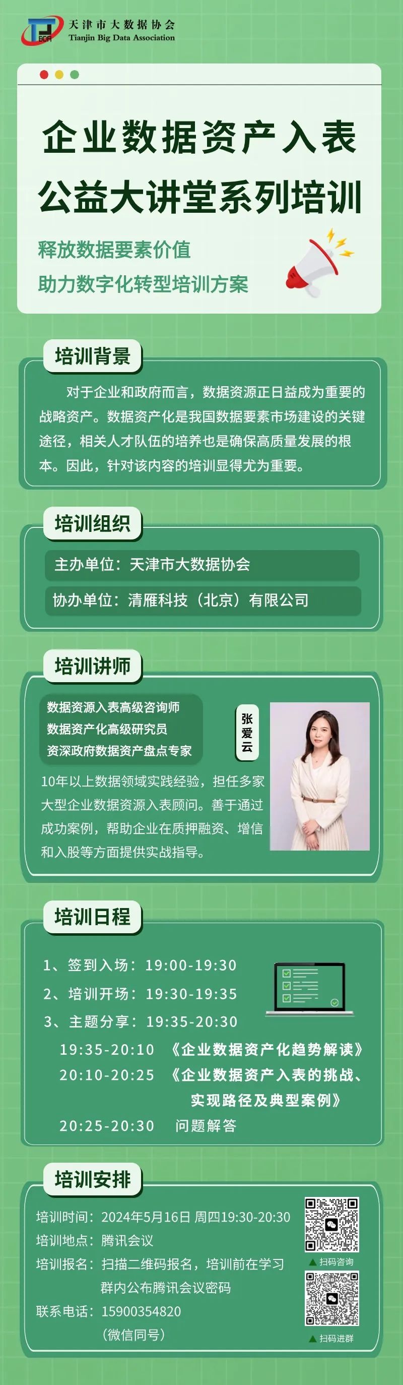 为加速企业与政府部门的数据资产化进程,提升数据要素市场的活力与效率,培育具备数据资产管理和价值发掘能力的人才队伍,天津市大数据协会携手清雁科技(北京)有限公司将于5月16日举办“企业数据资产入表公益大讲堂系列培训”。