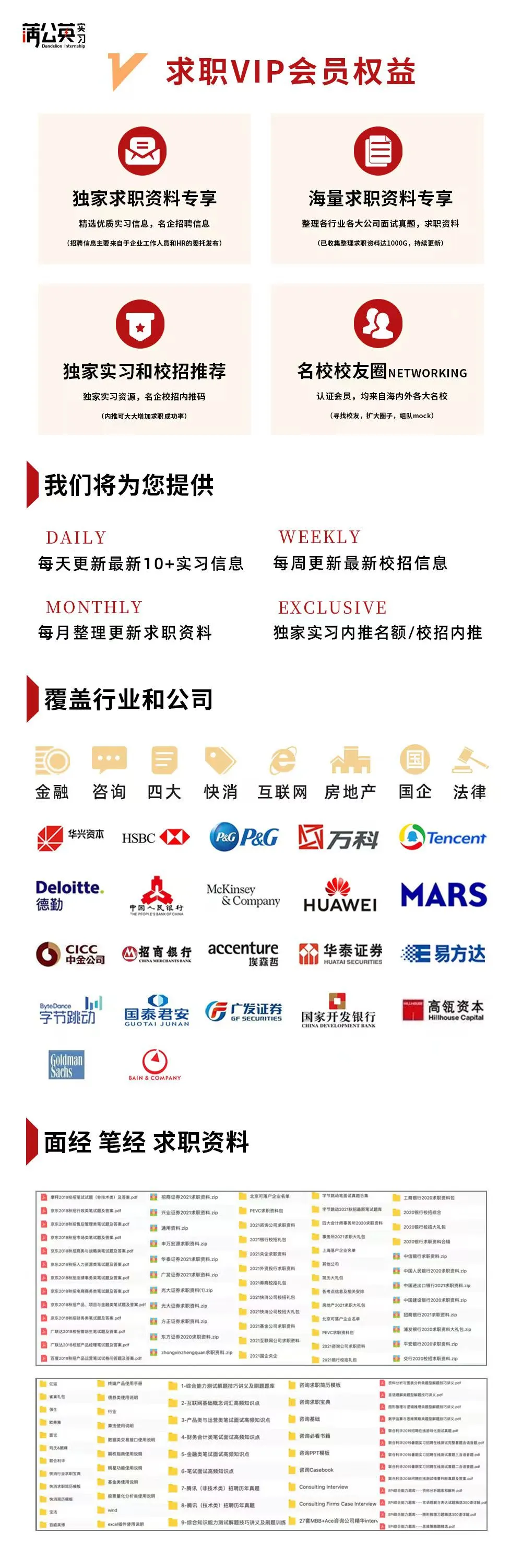 行业:外资投行、券商、事务所、公募基金、银行、互联网、快消、咨询、地产公司、国企央企、公职类、事业单位考试资料等等 购买会员可以获得至少50+独家新版央企笔试题库,200+地方2024年新版国企笔试面试资料;价值12500元+;200+新版四大OT、咨询OT、快消、投行 、外资投行 互联网、地产2024年模拟题库、真题库,价值超1万元;20+新版车企笔试题库,价值1000元;以及更新海外(英国、北美、澳洲、新加坡、欧洲)主流名企在线测评题 公司:瑞银集团、汇丰银行、德意志银行、易方达基金、汇添富基金、博时基金、华夏基金、央行、国开行、进出口银行、农业发展银行、五大行、建设银行、浦发银行、招商证券、申万宏源、广发证券、方正证券、国泰君安、光大证券、MBB、国家电网、中国石油、腾讯、字节跳动、阿里巴巴、华为、四大、立信、碧桂园、保利地产、恒大、万达、戴德梁行等等 其他:简历大礼包、北京/上海落户名单、各行业薪资表...... 《2024年券商笔面试资料》