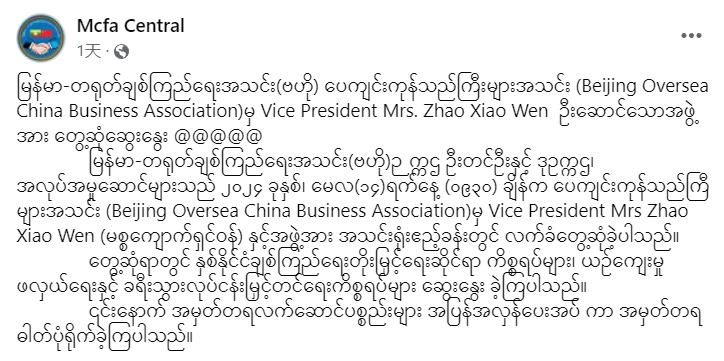 消息源:缅中友好协会(中央)脸书网页