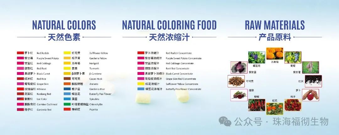 公司凭借多年积累的技术与成果能根 据客户的需求提供专属的解决方案,品种齐全,颜色多样。从资源、提取物到最终解决方案,无论任何环节,福彻公司一直坚持为客户提供贴合需求的产品和服务,并始终将食品安全放在首位。期待与全球优秀的客户结成永久合 作的战略伙伴!