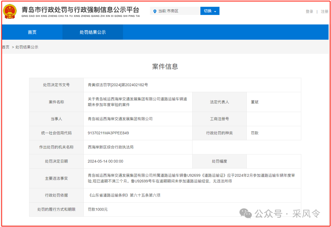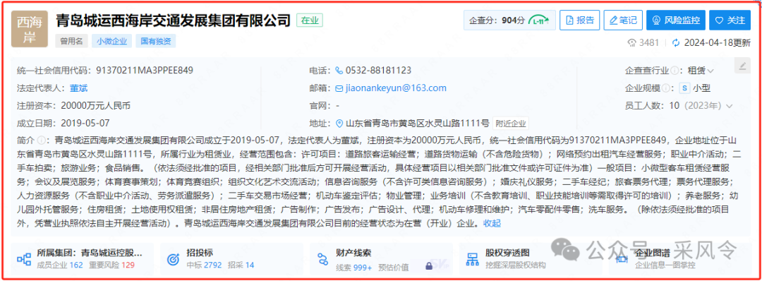 据公开资料显示,青岛城运西海岸交通发展集团有限公司成立于2019年5月7日,法定代表人为董斌,企业地址位于山东省青岛市黄岛区水灵山路1111号,其青岛城运控股集团有限公司持股100%。
