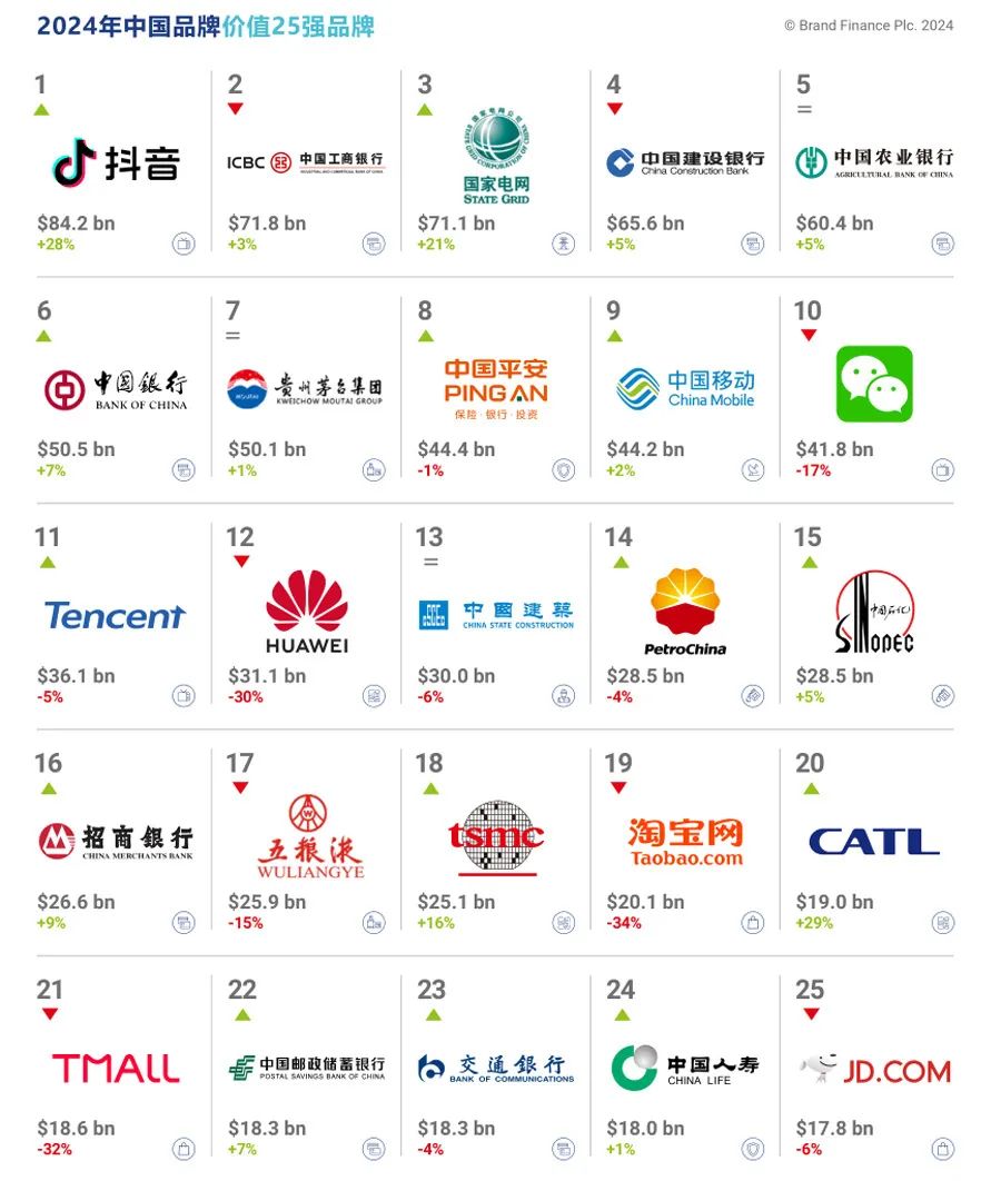 1、抖音 北京 媒体文化 841.99亿美元/+28.2% 2、中国工商银行 北京 银行 718.28亿美元/+3.3% 3、国家电网 北京 公用事业 711.45亿美元/+20.9% 4、中国建设银行 北京 银行 656.04亿美元/+4.7% 5、中国农业银行 北京 银行 603.98亿美元/+4.7% 6、中国银行 北京 银行 504.69亿美元/+6.6% 7、茅台 贵州 烈酒 500.95亿美元/+0.7% 8、中国平安 广东 保险 443.69亿美元/-0.7% 9、中国移动 北京 通讯 442.38亿美元/+2.0% 10、微信 广东 媒体文化 417.94亿美元/-16.8% 11、腾讯 广东 媒体文化 360.55亿美元/-5.3% 12、华为 广东 科技 310.97亿美元/-29.8% 13、中国建筑 北京 工程建筑 299.62亿美元/-6.1% 14、中国石油 北京 石油燃气 285.00亿美元/-3.9% 15、中国石化 北京 石油燃气 284.80亿美元/+4.9% 16、招商银行 广东 银行 266.44亿美元/+8.6% 17、五粮液 四川 烈酒 258.95亿美元/-14.5% 18、台积电 台湾 科技 250.52亿美元/+16.2% 19、淘宝 浙江 零售 201.47亿美元/-34.0% 20、宁德时代 福建 科技 190.36亿美元/+29.4% 21、天猫 浙江 零售 186.33亿美元/-32.1% 22、中国邮政储蓄银行 北京 银行 182.76亿美元/+7.3% 23、交通银行 上海 银行 182.55亿美元/-3.7% 24、中国人寿 北京 保险 180.08亿美元/+0.7% 25、京东 北京 零售 178.24亿美元/-6.0% 26、中国中铁 北京 工程建筑 175.87亿美元/-11.1% 27、中国铁建 北京 工程建筑 174.16亿美元/-8.5% 28、中国太平洋保险 上海 保险 153.39亿美元/+1.2% 29、中国电信 北京 通讯 142.11亿美元/-20.1% 30、中信银行 北京 银行 133.25亿美元/+5.6% 31、中国人民保险 北京 保险 132.75亿美元/+12.9% 32、友邦保险 香港 保险 132.27亿美元/-12.1% 33、网易 广东 媒体文化 129.45亿美元/+20.4% 34、比亚迪 广东 汽车 120.87亿美元/+19.9% 35、伊利 内蒙古 食品 116.06亿美元/-6.4% 36、中国能源建设集团 北京 工程建筑 110.65亿美元/+21.5% 37、兴业银行 福建 银行 107.17亿美元/-3.6% 38、万科 广东 房地产 104.62亿美元/-20.9% 39、保诚集团 香港 保险 102.81亿美元/+8.0% 40、中国电建 北京 工程建筑 102.50亿美元/-8.5% 41、浦发银行 上海 银行 98.76亿美元/-10.8% 42、美的 广东 科技 90.75亿美元/-11.6% 43、中国建材 北京 工程建筑 90.53亿美元/+1.6% 44、中国光大银行 北京 银行 85.66亿美元/-13.7% 45、美团 北京 零售 85.26亿美元/-15.0% 46、农夫山泉 浙江 非酒精饮品 83.06亿美元/+101.9% 47、泸州老窖 四川 烈酒 82.39亿美元/+6.4% 48、阿里巴巴 浙江 零售 79.11亿美元/-21.1% 49、中国民生银行 北京 银行 76.69亿美元/+1.9% 50、拼多多 上海 零售 76.67亿美元/-8.5% 51、中国交建 北京 工程建筑 75.85亿美元/-3.5%52、华润置地 广东 房地产 72.93亿美元/-8.0% 53、杏花村汾酒 山西 烈酒 72.37亿美元/-13.6% 54、海尔 山东 科技 65.67亿美元/-15.0% 55、保利发展控股 广东 房地产 64.01亿美元/-21.7% 56、洋河 江苏 烈酒 63.46亿美元/-7.3%57、小米 北京 科技 62.59亿美元/-15.7% 58、格力 广东 科技 59.30亿美元/-25.9% 59、顺丰速运 广东 物流 58.73亿美元/-28.7% 60、中冶集团 北京 工程建筑 57.89亿美元/-29.3% 61、碧桂园 广东 房地产 57.28亿美元/-35.8% 62、中国中车 北京 工程建筑 56.41亿美元/-13.7% 63、联想 北京 科技 55.89亿美元/-12.7% 64、中国海油 北京 石油燃气 55.24亿美元/+2.0% 65、中国邮政 北京 物流 54.85亿美元/-13.3% 66、蒙牛 内蒙古 食品 54.17亿美元/-11.1% 67、中国海外发展 香港 房地产 52.19亿美元/-34.2% 68、海康威视 浙江 科技 49.80亿美元/-27.0% 69、周大福 香港 服饰 49.56亿美元/-17.1% 70、江苏银行 江苏 银行 49.32亿美元/+5.9% 71、国泰人寿 台湾 保险 48.99亿美元/+9.1% 72、绿地 上海 房地产 48.71亿美元/-30.4% 73、华夏银行 北京 银行 48.53亿美元/+3.6% 74、富邦金控 台湾 保险 48.10亿美元/-12.3% 75、中华电信 台湾 通讯 47.12亿美元/-11.4% 76、龙湖集团 北京 房地产 46.66亿美元/-44.6% 77、百度 北京 媒体文化 46.25亿美元/-30.5% 78、古井贡酒 安徽 烈酒 44.43亿美元/+10.5% 79、京东方 北京 科技 43.79亿美元/-5.1% 80、携程 上海 旅游休闲 43.78亿美元/+31.0% 81、四川路桥集团 四川 工程建筑 43.01亿美元/+17.2% 82、雪花啤酒 北京 啤酒 42.91亿美元/+22.4% 83、海天 广东 食品 42.53亿美元/-31.8% 84、新华保险 北京 保险 42.44亿美元/+5.5% 85、广发银行 广东 银行 41.92亿美元/-2.9% 86、江铜集团 江西 矿业及金属 41.28亿美元/-8.7% 87、中国联通 北京 通讯 41.24亿美元/-4.2% 88、招商蛇口 广东 房地产 39.85亿美元/-4.0% 89、安踏 福建 服饰 38.04亿美元/-2.7% 90、日月光半导体 台湾 科技 37.62亿美元/+35.6% 91、统一 台湾 食品 37.09亿美元/+7.6% 92、国电电力 北京 公用事业 37.05亿美元/-15.4% 93、中信证券 广东 银行 36.57亿美元/-26.6% 94、台湾大哥大 台湾 通讯 36.25亿美元/+8.8% 95、国药集团 北京 医药 35.54亿美元/-5.7% 96、京东物流 北京 物流 35.33亿美元/+1.0% 98、哈弗 河北 汽车 35.09亿美元/-34.3% 99、今日头条 北京 媒体文化 34.77亿美元/-5.3% 100、海螺水泥 安徽 工程建筑 34.74亿美元/-5.1% 品牌价值是与品牌声誉相关的收入的净现值。通常企业通过商标权来拥有和控制这些收入。Brand Finance以品牌特许授权协议为基础,对品牌使用者实际为品牌支付的特许授权费用进行审查,这种方法被称为“特许费率法”。预测和评估品牌收入,即根据运营机构的预期营业额分析,结合品牌专属的特许费率,评估及预测品牌将来能为企业带来的收入。税后的品牌收入通过现金流折现到估值日,其总和则是品牌在该估值日的品牌价值。