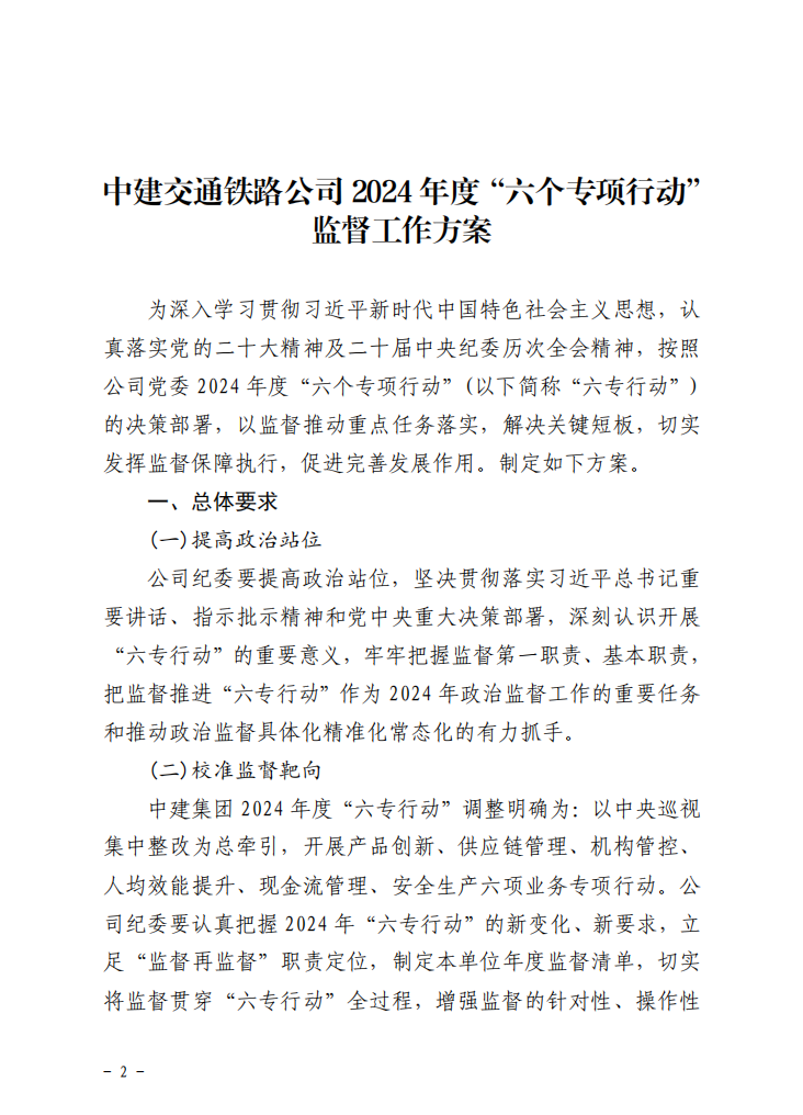 公司纪委立足监督主责,结合公司实际,制定下发了《中建交通铁路公司2024年“六个专项行动”监督清单》,明确监督类别3项,具体监督项55条,进一步厘清监督内容,推动各业务部门提高政治站位,切实发挥监督保障执行、促进完善发展作用。