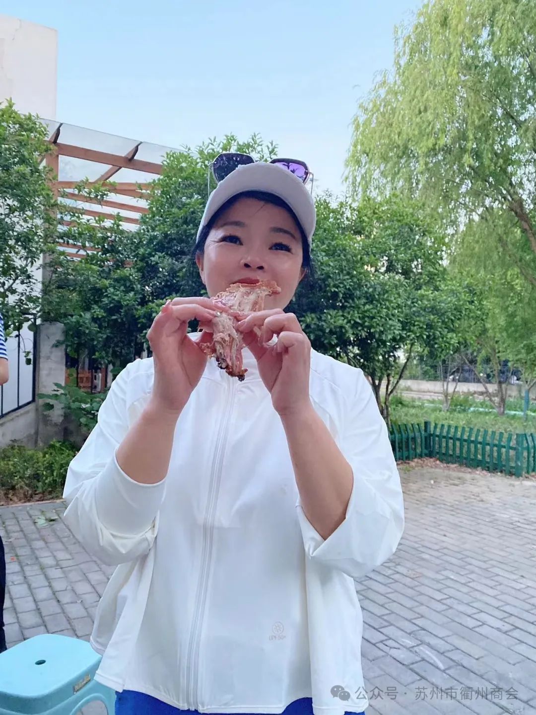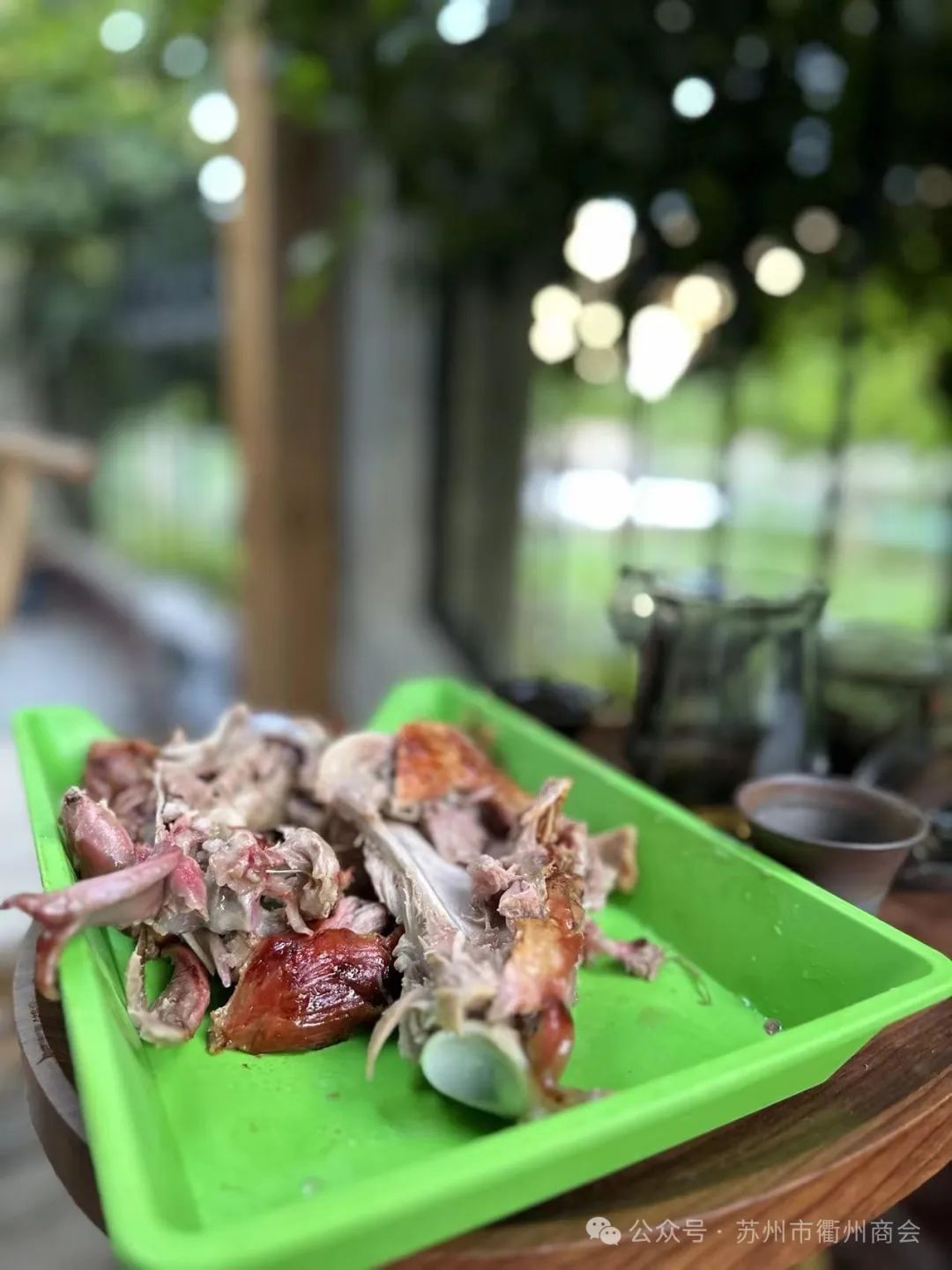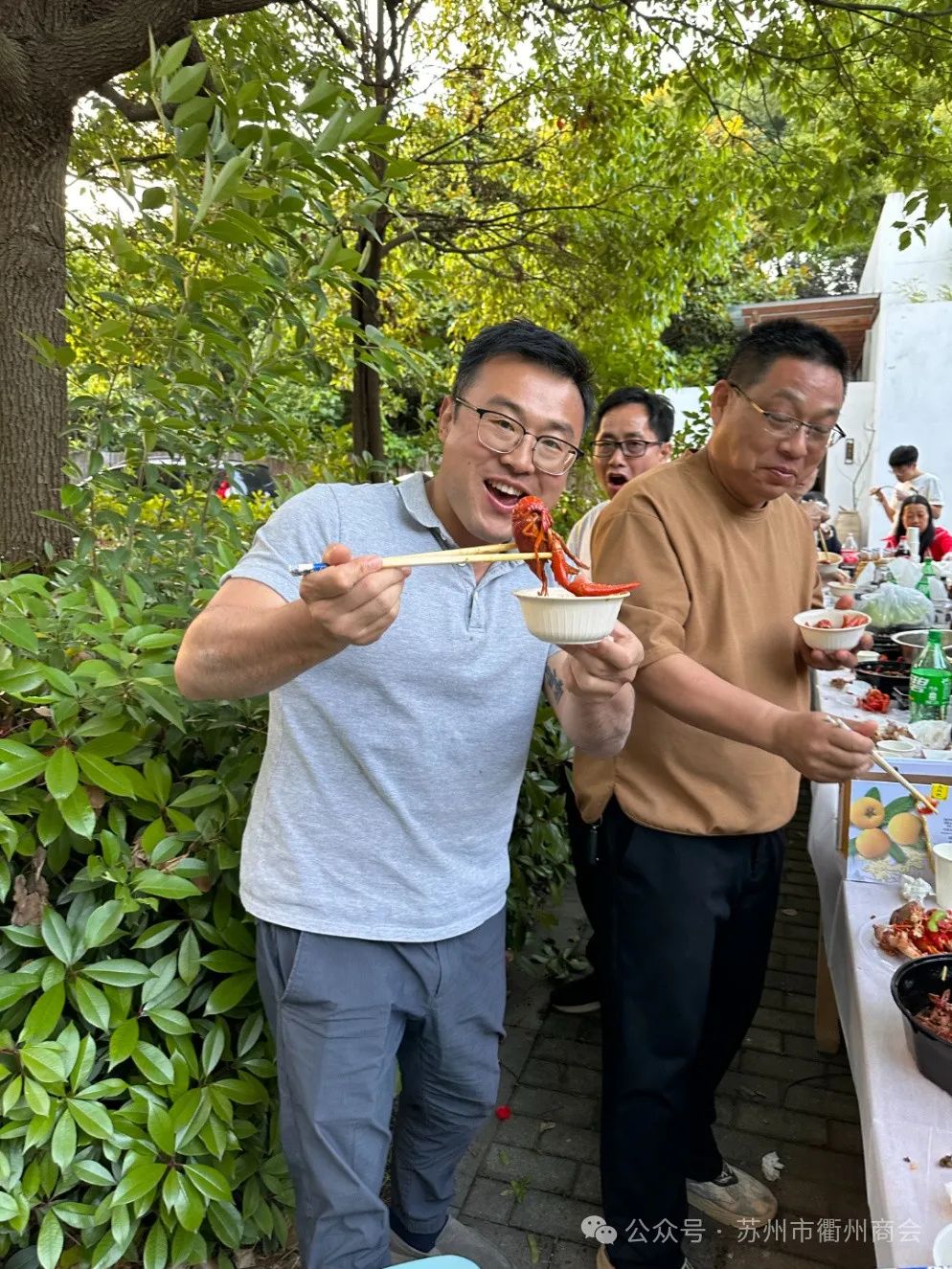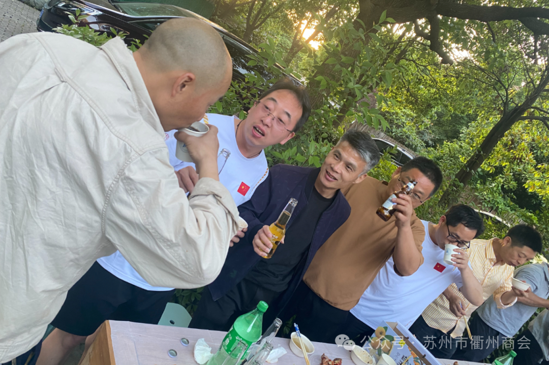 此次庆功宴并未设酒店宴请,亦无表演节目,简约而温馨。于小院树荫下仅摆放数张桌椅,覆以纯白桌布,伴着悠扬音乐,供应烤全羊、龙虾、啤酒以及衢州特色小食等美食。