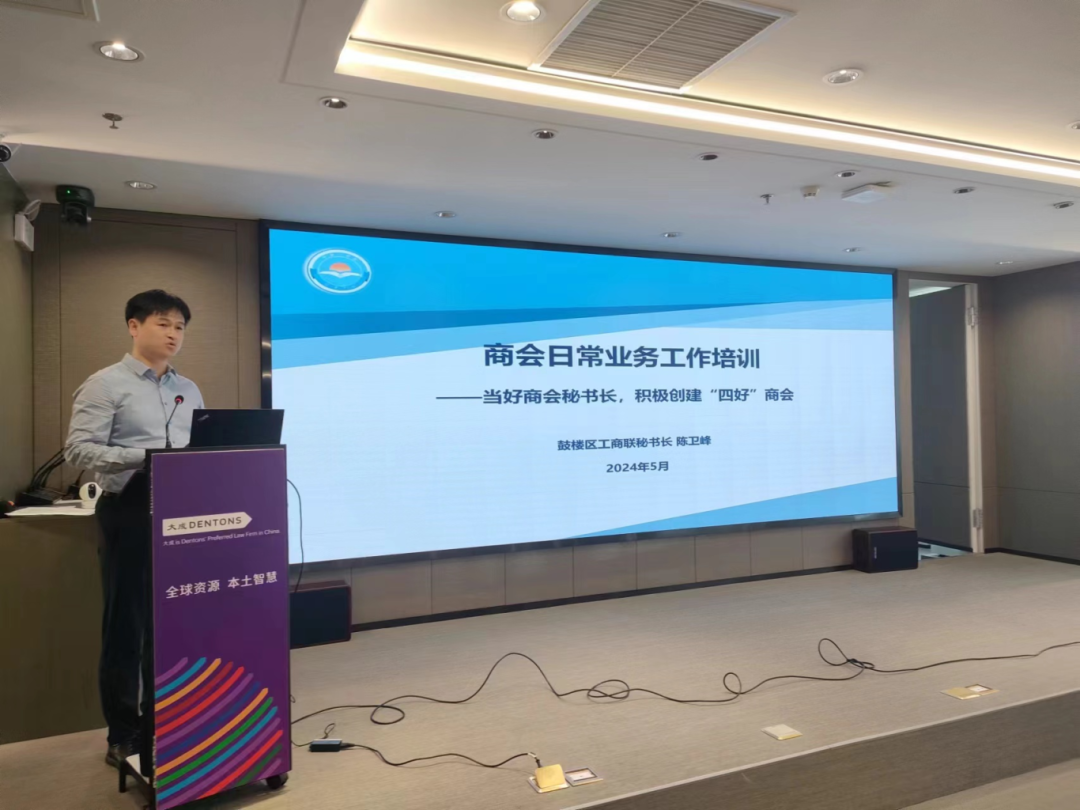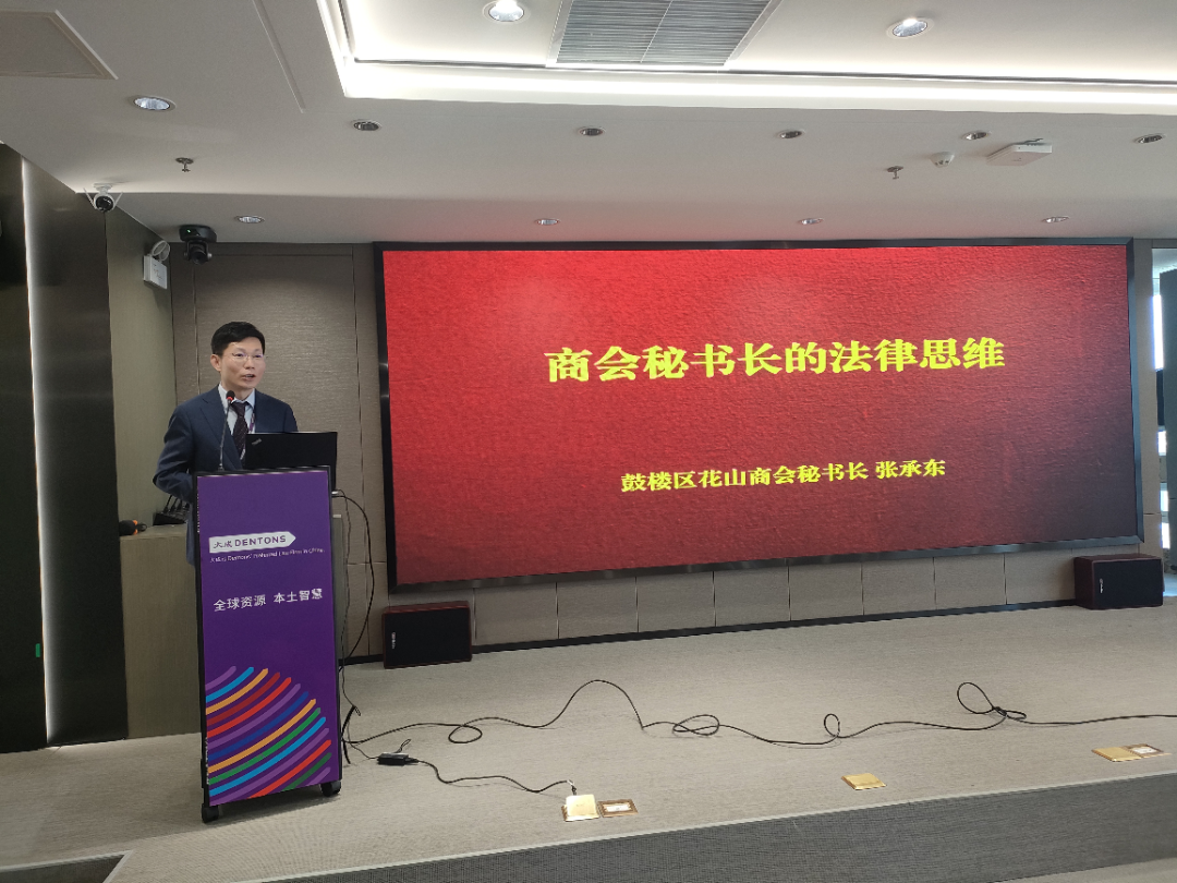 鼓楼区花山商会秘书长、北京大成(南京)律师事务所高级合伙人张承东以《商会秘书长的法律思维》为题进行授课,张承东结合自身工作实践和现行法律法规,从商会经营、商会内部架构设置、商会章程设置、商会党建4个方面详细讲解了如何推动商会依法依规运行。